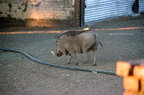 Als wir dann am Abend vor dem Bungalow saßen und den Sonnenuntergang genossen, hörten wir das "Haustier" im Hof umherwandern. Das Warzenschwein schien schon ein paar Jahre auf dem Buckel zu haben, denn es hatte bereits mächtige Hauer. Es schien sich nicht für uns zu interessieren - und das war gut so. Nicht dass wir angst gehabt hätten, aber so ein Warzenschwein auf dem Schoß wäre doch etwas schwer gewesen ;-) |