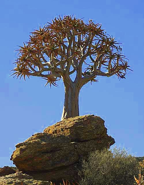 Da es noch früh war, fuhren wir zum Köcherbaumwald, der mittlerweile zum National Monument erklärt wurde. All die Bäume waren sehr beindruckend - mal standen sie vereinzelt, dann wieder ein ganzer Wald. Es schien, als wären sie verkehrtherum eingegraben und die Wurzeln reichten zum Himmel. Die Eingeborenen verwenden diese Bäume zum Transportieren von Wasser, da sie innen hohl sind. Die Buschmänner verwenden diese Bäume auch als Köcher für Ihre Pfeile - daher der Name Köcherbaum - Kookerboom oder auch Quivertree. Der Giantsplayground (Spielplatz der Riesen) war sehenswert. Ein Rundwanderweg führte uns durch eine bizarre Felslandschaft.... Da die Farm eigene Geparden hatte - auch