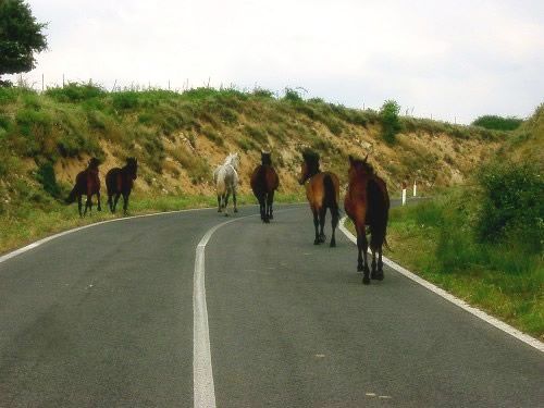 sie rannten los. Der Schimmel war wohl der Anführer - er drehte sich immer wieder um. Langsam fuhren wir hinterher, bis die Herde von der Straße abbog. Es dauerte einige Zeit, da rechts und links der Straße Zäune waren. |