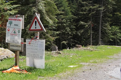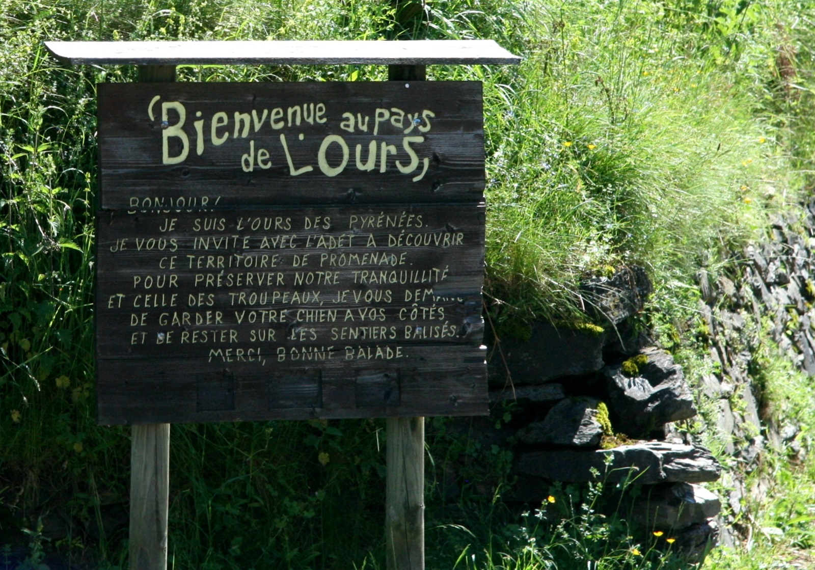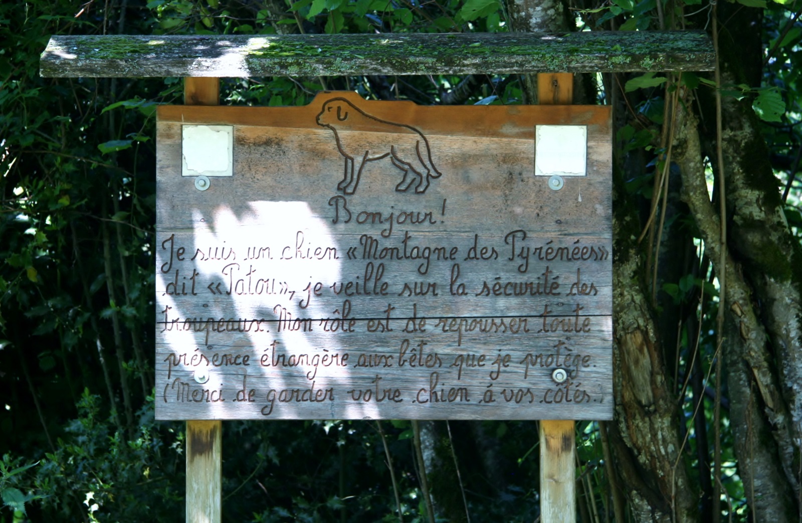 Das Schild sagt sinngemäß, dass man auf die Pyrenäenschäferhunde acht geben soll. Die bewachen die Herden und machen nur ihren Job. |