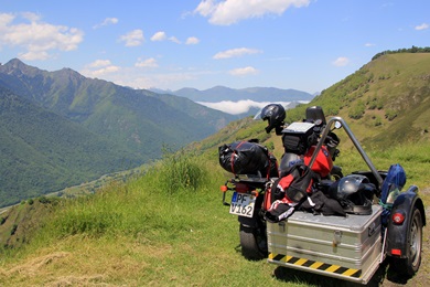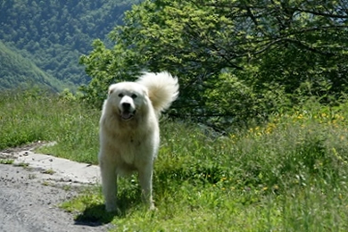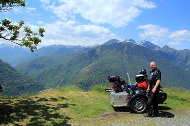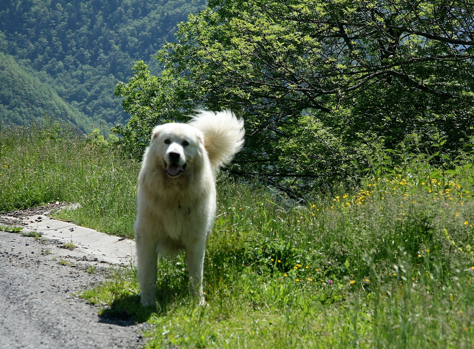 In dieser Region wachen die Pyrenäischen Schäferhunde. Dieser bewachte eine Herde Ziegen, die am Straßenrand graßten und kam angerannt. Als wir an ihm vorbeifuhren blickte er von oben auf mich herab - da fühlte ich mich im Seitenwagen gar nicht mehr wohl, aber er war nicht böse - nur wachsam. |