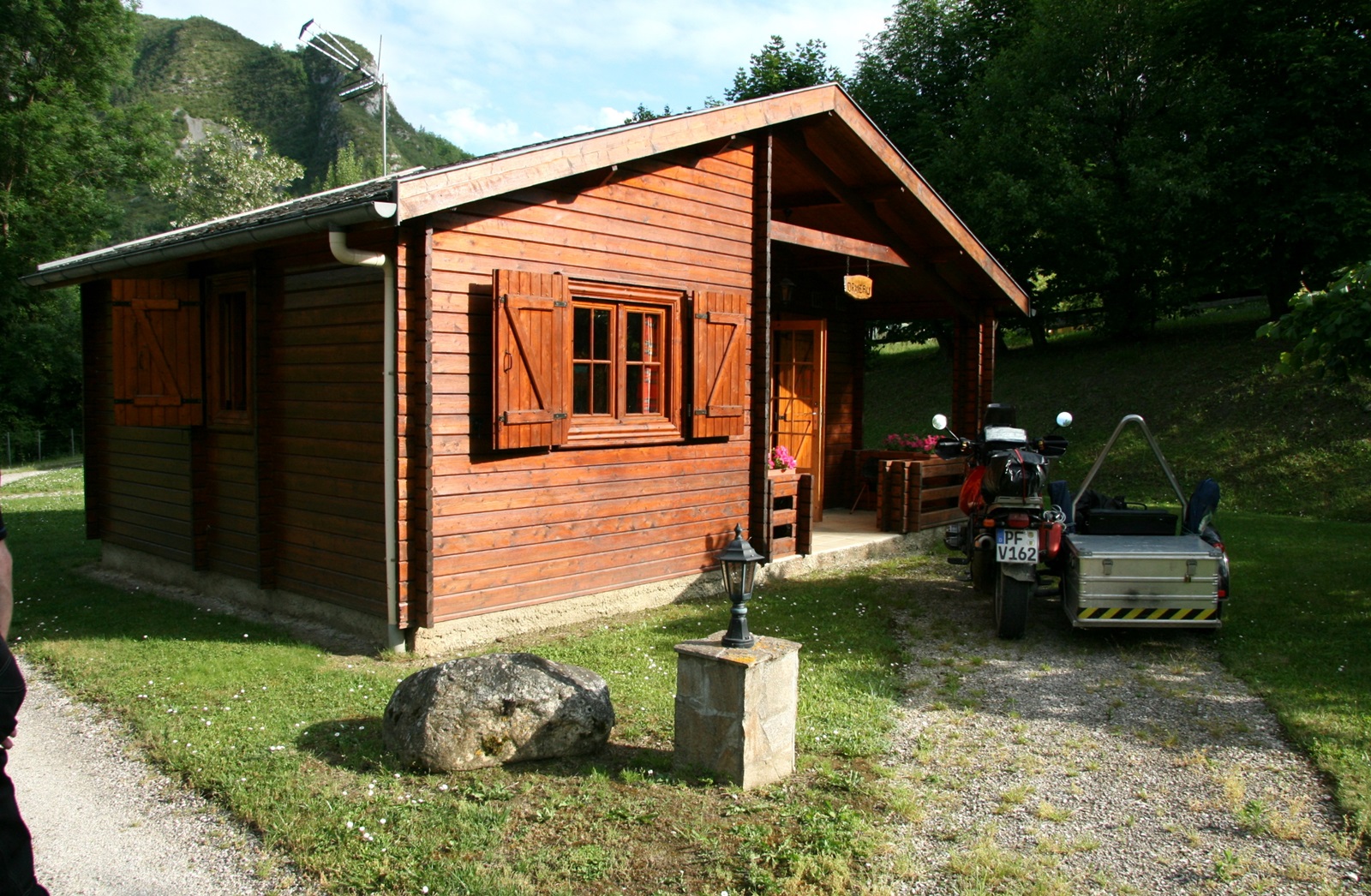 Abfahrt vom Col de Port D618 Richtung Tarascon-sur-Ariege. | Wir übernachteten auf einem Campingplatz mit Holzhütten an der D618 in Saurat kurz vor Tarascon-sur-Ariege. Gut war, dass ebenfalls ein Restaurant mit dem Namen "Le Chalet" angegliedert war. Es kamen auch viele Einheimische zum Essen. Schlecht war, dass so viele Moskitos unser Blut haben wollten.