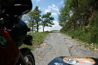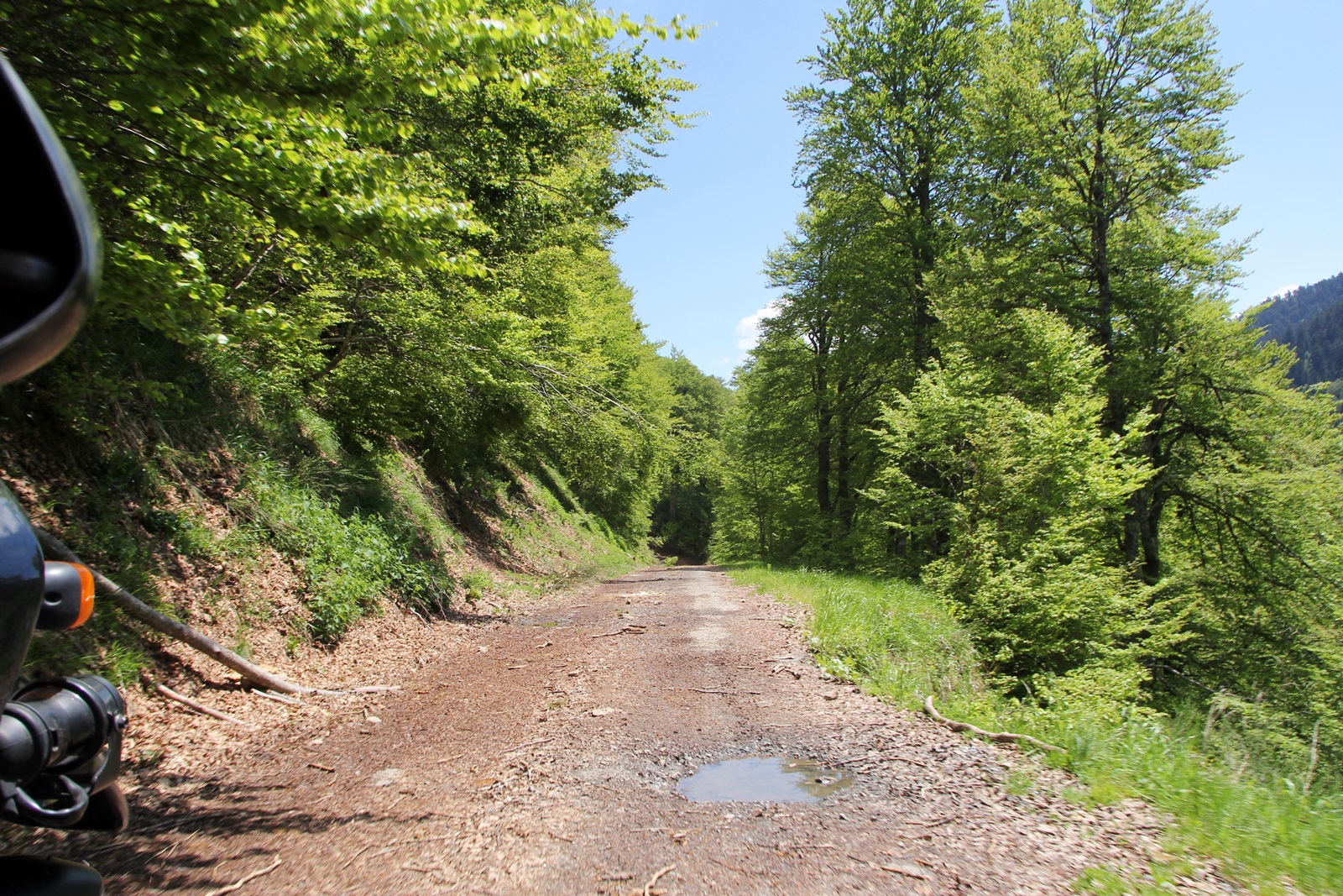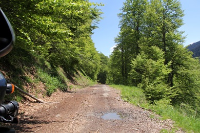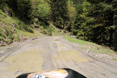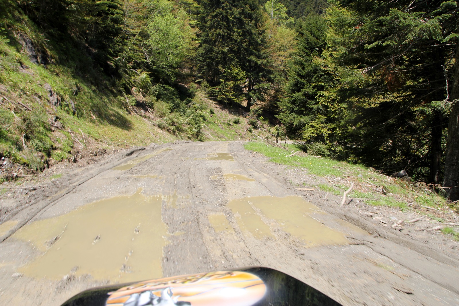 Jochen vor imposanter Kulisse | nach dem Asphalt kommt Schotter und dann Waldweg - hier nach einem heftigen Regen.... und irgendwo unterwegs hielten 2 Waldarbeiter mitten auf dem Weg Siesta. Sie sprangen auf und schauten uns an, als kämen wir von einem anderen Stern....hmmm warum nur?