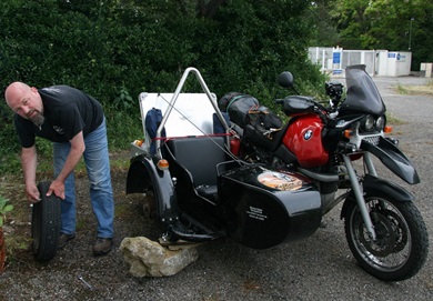 In Carcassonne gab es jede Menge Hotels und Motels, doch wir entschieden uns mal wieder für ein Etaphotel. Der Grund - bequeme Betten, zweckmäßig, aber alles vorhanden, sauber, zentral gelegen und hatte vorallem einen abgeschlossenen Parkplatz, was für so eine Touristenstadt nicht unwesentlich ist. Jochen prüft den Reifen - irgendetwas scheint da nicht zu stimmen. Da wir keinen Wagenheber dabei hatten, tat es auch ein großer Stein. |