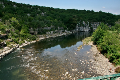 Das Dorf liegt am Ufer der Ardèche am Fuße einer Steilwand aus Kalkstein . Es wird dominiert vom Château de Vogüé, einer im 17. Jahrhundert erbauten mittelalterlichen Burg. Heute ist sie wohl in Privatbesitz. Vogüé gehört ebenfalls zu den Plus beaux villages de France. Wir beschlossen in Vogue Essen zu gehen und entdeckten ein schickes Restaurant direkt am Ufer der Ardeche. Der nette Kellner vom Restaurant La Falaise wollte uns nichts mehr verkaufen, weil es bereits kurz vor 14:00h war und das Restaurant Siesta plante. Und das in einem Dorf, das hauptsächlich vom Tourismus lebt. Tja das ist Frankreich. Mit knurrenden Magen fuhren wir weiter. |