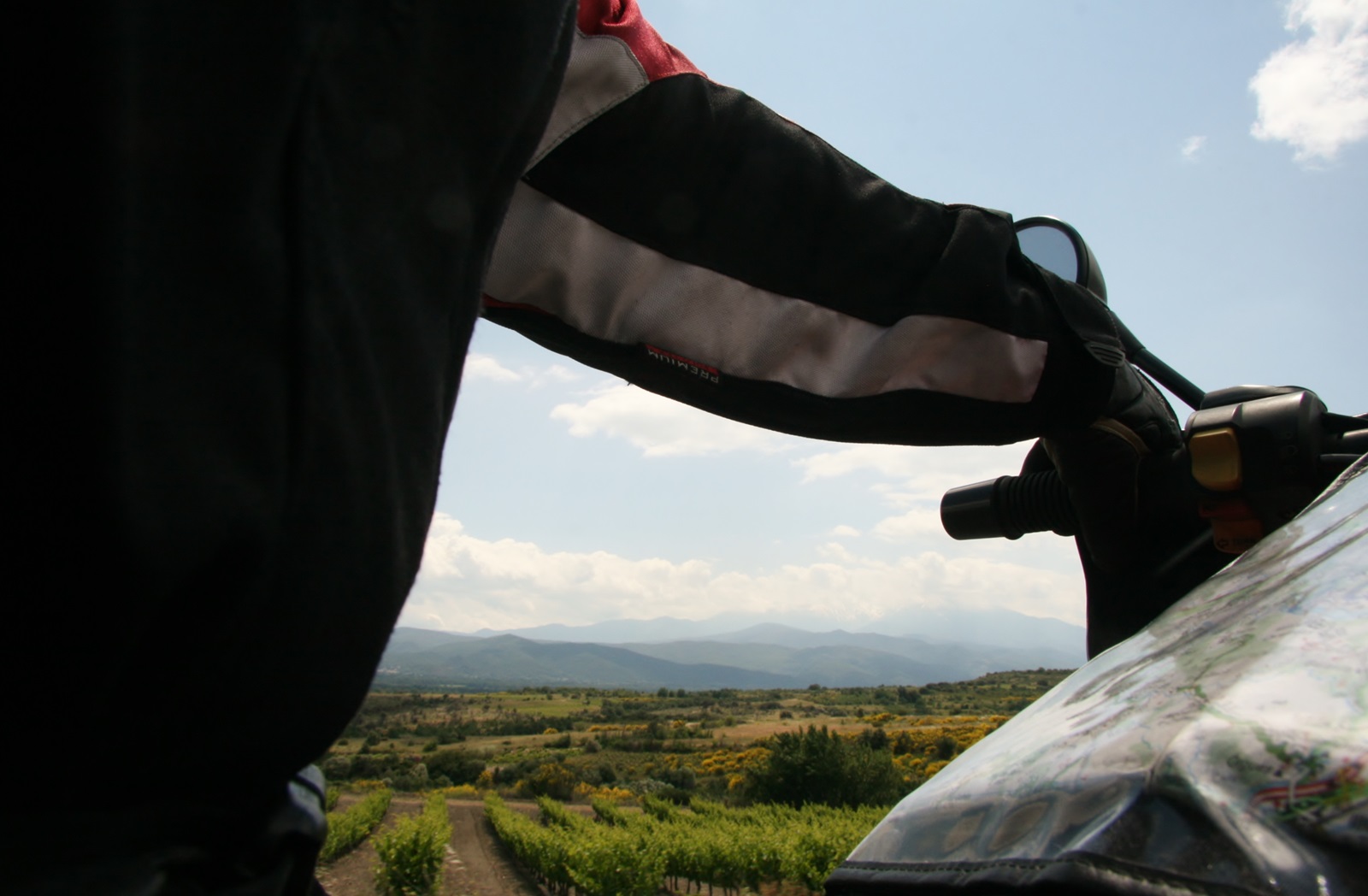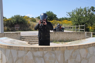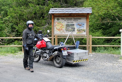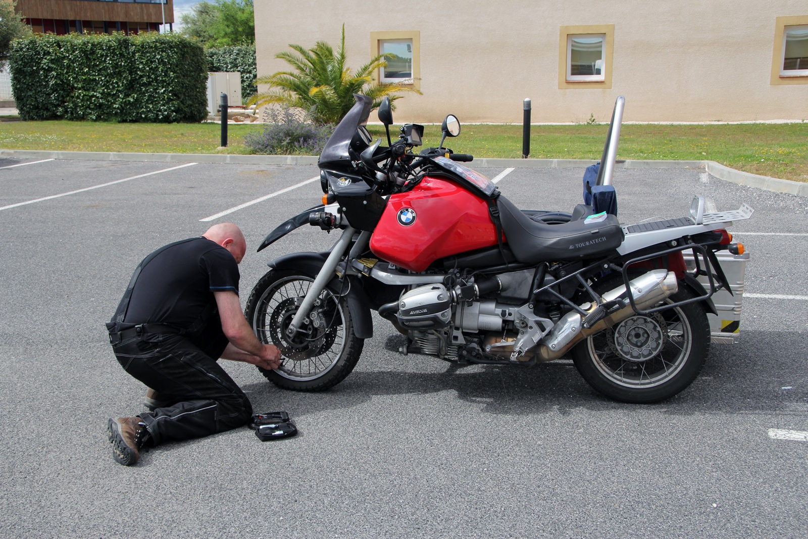 Jochen checkt den Vorderreifen - es war zu wenig Luft drin. Gestern schien alles noch in Ordnung zu sein. Nachdem wir Luft nachgefüllt hatten fuhren wir zum |