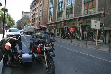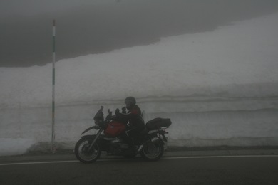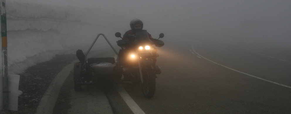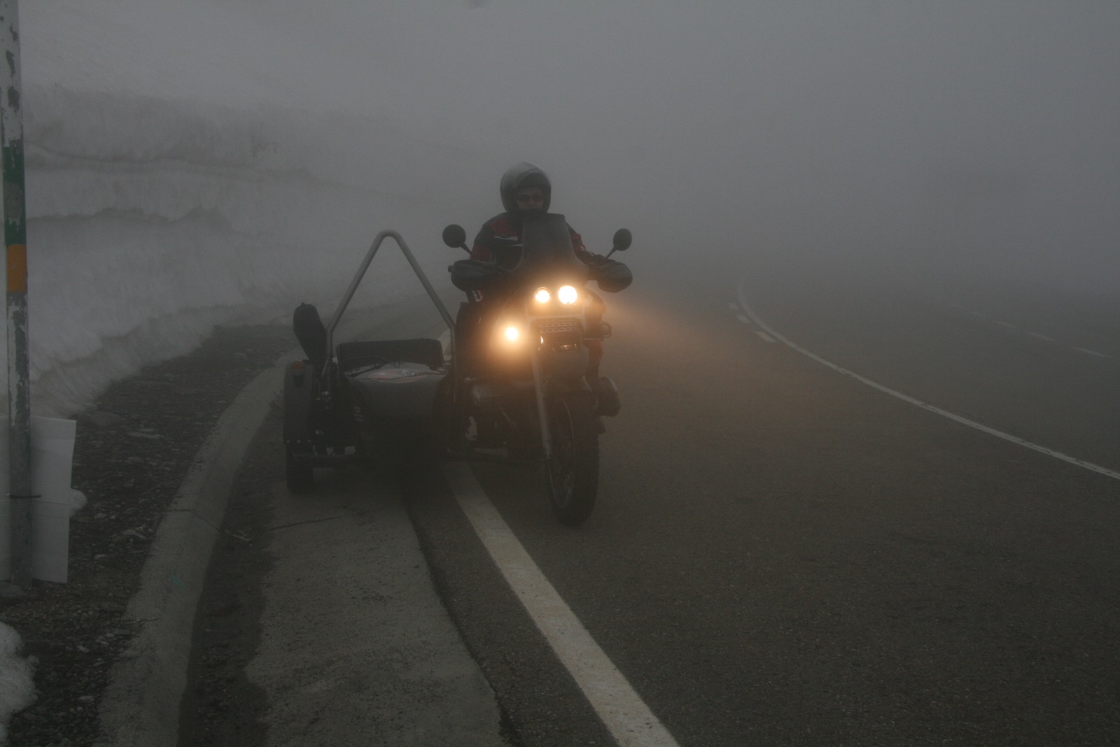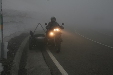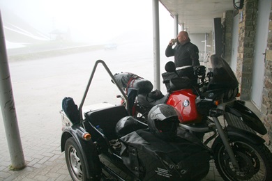 Nach gefühlten Stunden begann sich der Nebel zu lichten, aber gleichzeitig fing der Regen an - immer heftiger und es wollte nicht mehr aufhören. Fahrzeuge fuhren in Schrittgeschwindigkeit vorbei.... irgendwann beschlossen wir doch weiterzufahren. Bei Nebel und Regen mit Aquaplaning auf einem Pass bei 2000 nN setzte ich mich gerne in den Seitenwagen. Für Jochen war das eine leichte Übung zu fahren und mittlerweile ging es seiner Hand wieder ganz gut. |