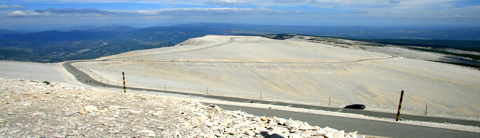 Der Mont Ventoux ist mit seinen 1.912 m der höchste Berg in der französischen Provence und ist so ziemlich der einzige Berg auf weiter Flur. Der Gipfel ist einer der wenigen Orte, von denen man bei sehr gutem Wetter das Mittelmeer, die höchsten Gipfel der Alpen und der Pyrenäen sehen kann. Man findet auf dem Gipfel auch einn Observatorium und verschiedene Sendeanlagen. Wegen der schweren Steigung ist der Mont Ventoux im Sommer bei den Radrennfahrern vor allem wegen seiner kahlen Kuppe gefürchtet. Hier oben kann es sehr heiß werden und meistens bläst ein orkanartiger Wind. Jährlich sterben wohl ca. 10 bis 20 der sich am Berg versuchenden Sportler durch Überforderung oder Unfälle. Na ja, die Rennradler fuhren bergab oftmals mit ca. 80- 90km/h Sachen - wahnsinn! |