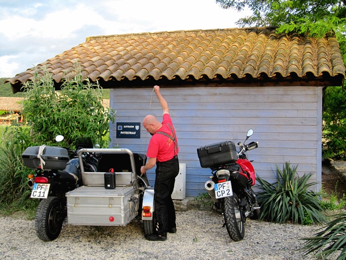 Ich wollte in diesem Urlaub das Motorradfahren lernen (Führerscheinneuling mit 40+) und da wollte ich am liebsten alles selber fahren... und Jochen musste sich auf gemütliche Fahrweise einstellen ;-) Nach langem Überlegen und vielem Für und Wider entschieden wir uns für Südfrankreich - wieder an die Ardeche - wo wir schon auf der Rückreise von den Pyrenäen Pause machten. Wir buchten 1 Woche Halbpension in der Domaine de Ribiere in Grospierres, ca. 10 km von der Ardeche entfernt..