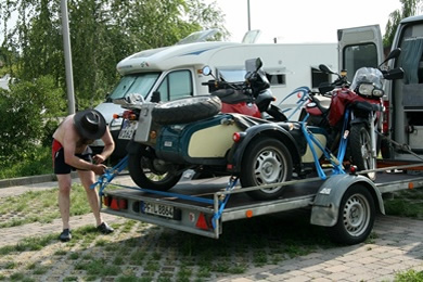 war das Gespann und das Motorrad auf dem Hänger verzurrt und