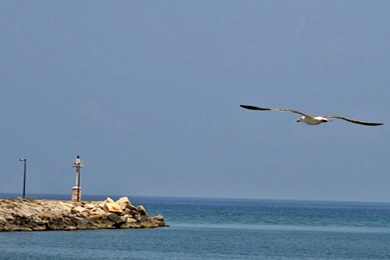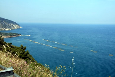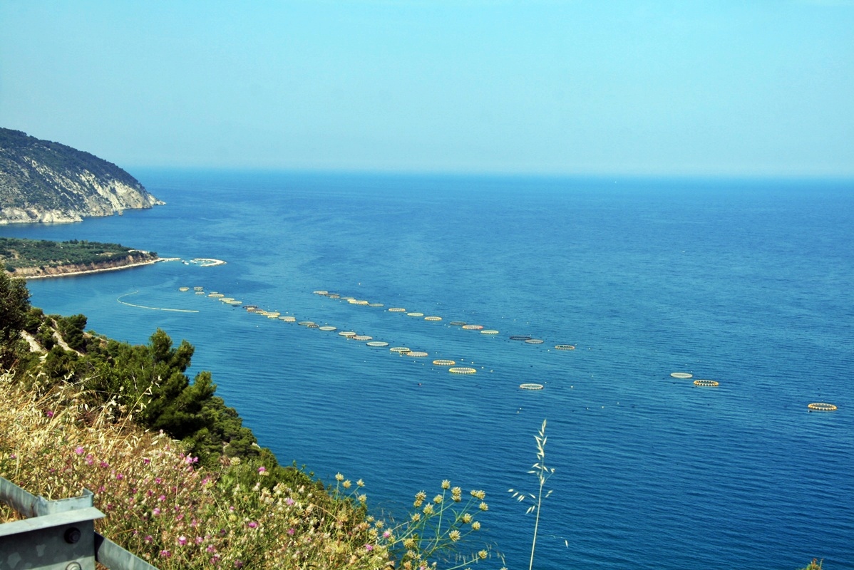 Im Hintergrund die Bucht von Mattinata mit tausenden von Olivenbäumen.. Das Städtchen liegt auf halber Höhe der Küste im Valle Carbonara. Ein langer Strand aus weißen Kieseln. Viele sagen, dass dieser Küstenabschnitt der Amalfi-Küste in nichts nachsteht. Es gibt kleine Restaurants, Pensionen und Campingplätze, |