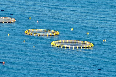 Fischzuchtstationen im Meer - auch genannt Aquakultur mit einem Durchmesser von ca. 10 Meter. Hier werden Fische für die umliegenden Restaurants aufgezogen und auch für den Handel. |