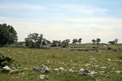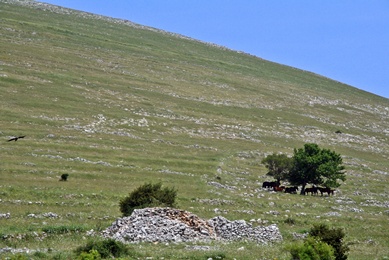 | weites unbewohntes Land | karge Landschaft - unter Bäumen halbwilde Pferde |
