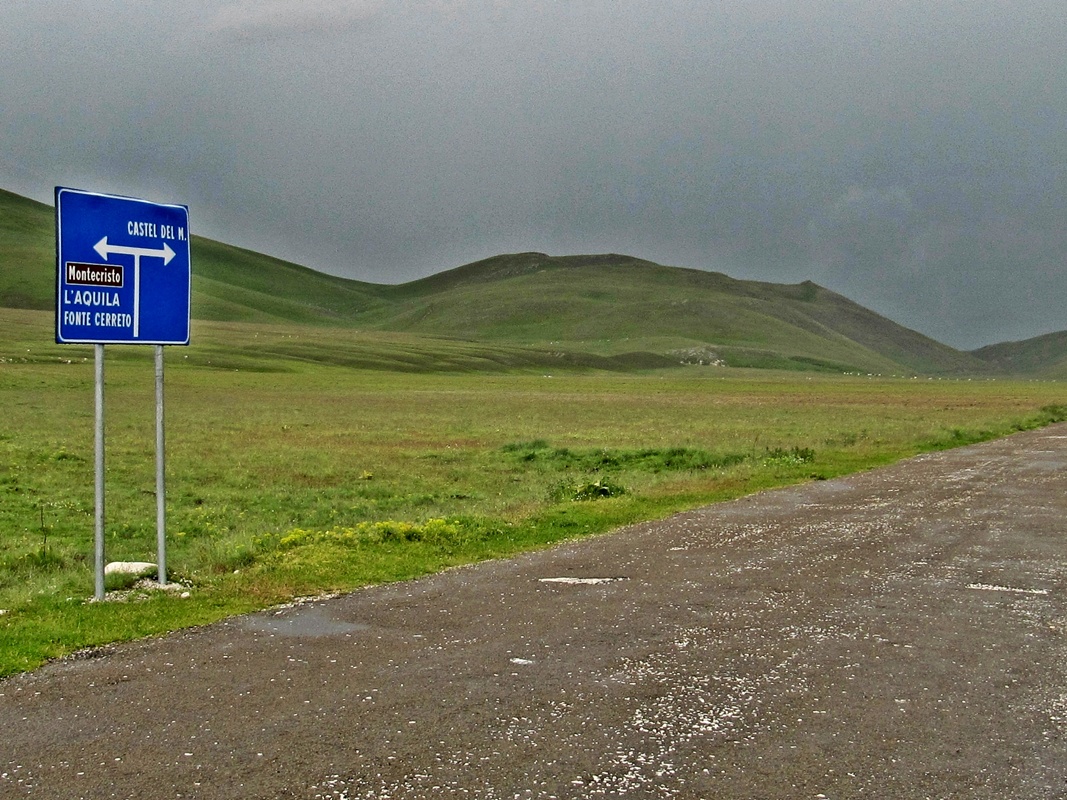 | Glücklich, endlich den Campo Imperatore mit unseren Motorrädern bezwungen zu haben, und dabei noch mit einer tollen Fernsicht, machten wir uns anschließend auf den Weg über die Hochebene nach Castelli und Castel Castagna gen Norden. Wir fuhren über die SS80 Richtung Rocca Santa Maria und anschließend die SP237 bis Montefalcone. Was sollen wir sagen - die Strecke war einfach traumhaft. Hügeliges, kurviges, grünes Land mit viel Ackerbau und kleinen Dörfern entlang der Route. |