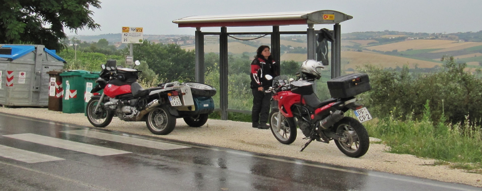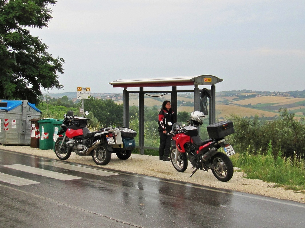 wie sollte es anders sein, es fing am Nachmittag wieder an zu regnen. Erst war es nur Niesel, dann immer stärker. In dieser Region schien es in den letzten Tagen schon öfters heftig geregnet zu haben. Viele Straßen standen teilweise schon unter Wasser oder Sturzbäche überquerten die Straßen. Es machte keinen spass mehr. Jochen mit seinen 3-Rädern hatte es da viel besser. Ich hatte mächtig mit Aquaplaning zu kämpfen und es kostete viel Nerven. Immer wieder suchten wir Unterstände, wie Bushaltestellen oder unter Balkonen am Straßenrand wenn der Regen gar zu heftig wurde..