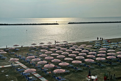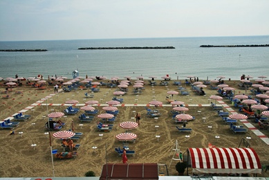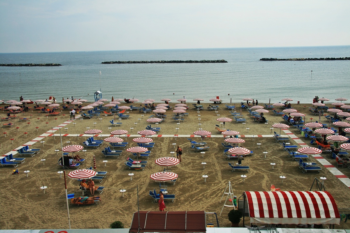 Wie immer wechselte das Wetter am Nachmittag und es drohten mal wieder dicke dunkle Wolken mit Regen. So kehrten wir freiwillig ans Meer zurück. Da wir nicht schon wieder im Stau von Rimini landen wollten, richten wir unsere Route so ein, dass wir erst nördlich von Rimini aufs Meer trafen. Wir fuhren gen Norden in der Hoffnung ein passendes Hotel zu finden. Dieses fanden wir dann in Igea Marina. Ein Hotel reihte sich hier an das andere. Im Touinghotel Spiaggia wurde schon deutsch gesprochen und wir bekamen ein Zimmer mit Meerblick. |