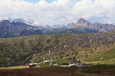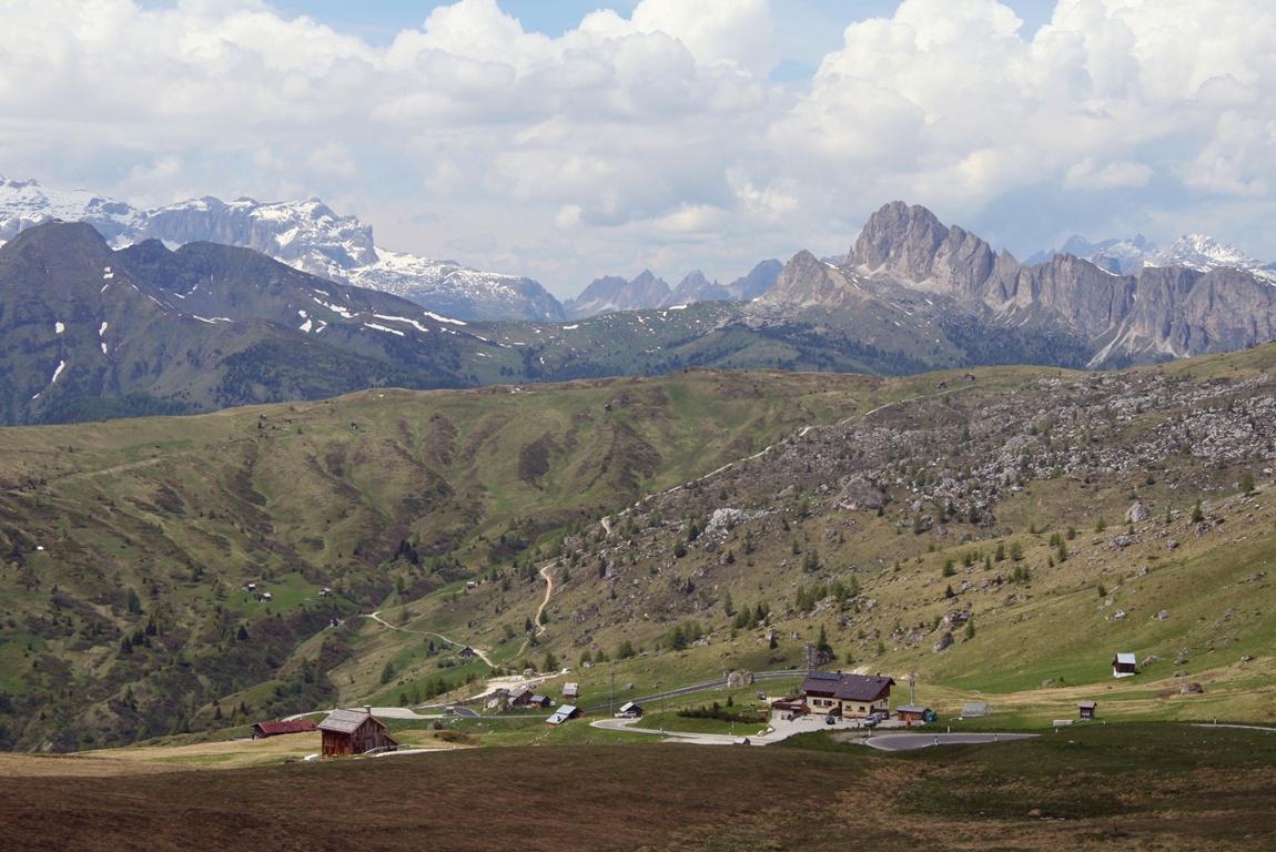 Marmolada und die Sellagruppe im Westen sowie auf den Falzáregopass