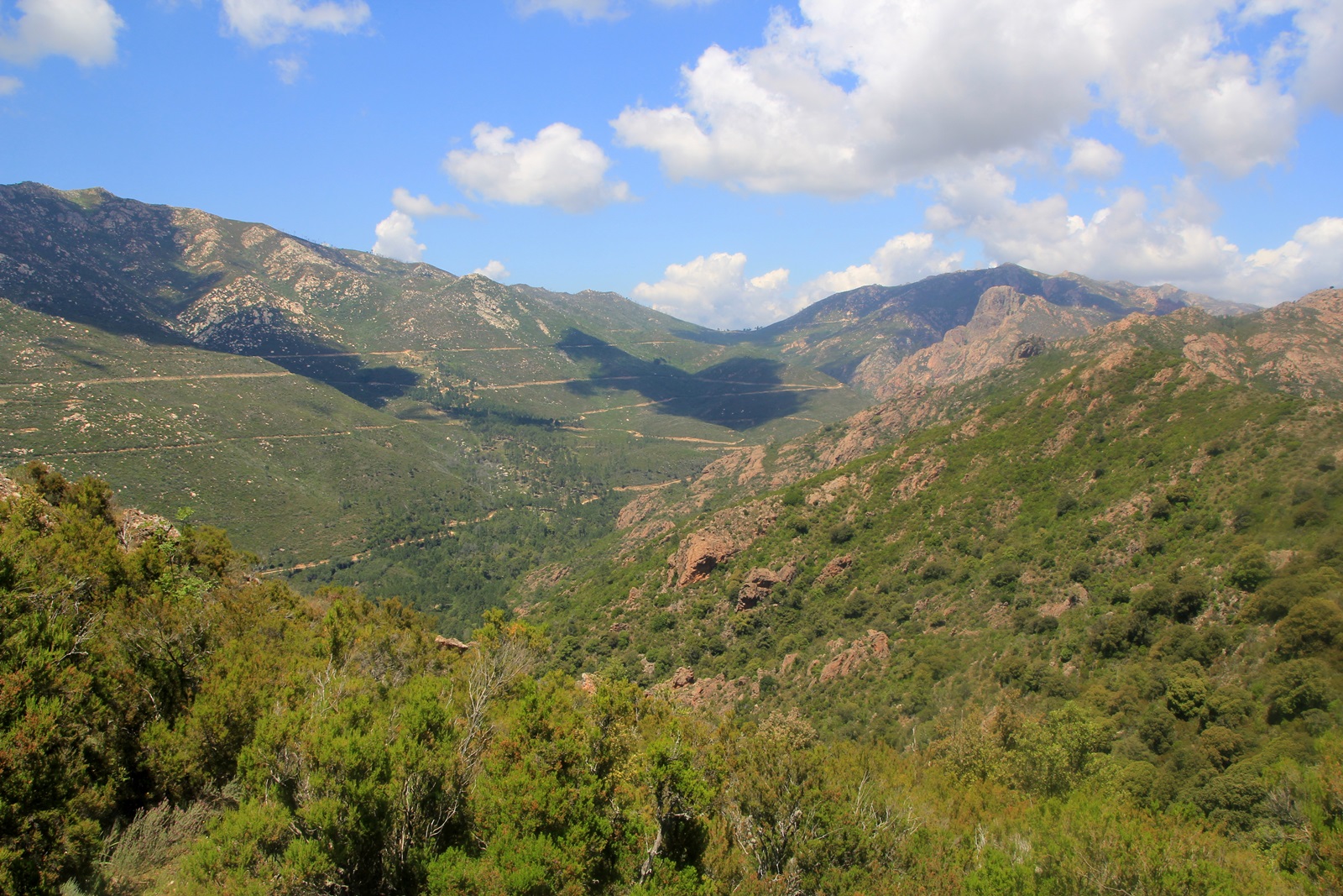 Das schmale Sträßchen führt weiter Berg aufwärts, überquert den Baraci, heißt ab nun D19 und erreicht schliesslich den Col de Siu (kein Schild vorhanden). Hoch über dem Baracital fährt man nun südwärts und gelangt zu schönen roten Gebirgszügen. |