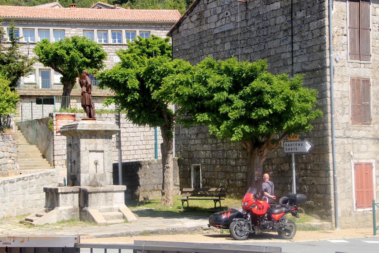 Arbellara an der D19 Der kleine Ort wird von einem markanten Wohnturm überragt. Ganz in der Nähe "fanden" wir mehr oder weniger zufällig die bekannte genuesische Brücke - Pont d'Acoravo, die den Fluss überspannt. Die Brücke ist von der Strasse aus fast nicht mehr zu sehen, weil sie von dichten Bäumen umrahmt wird. Zahlreiche Gumpen luden zum Baden ein. |