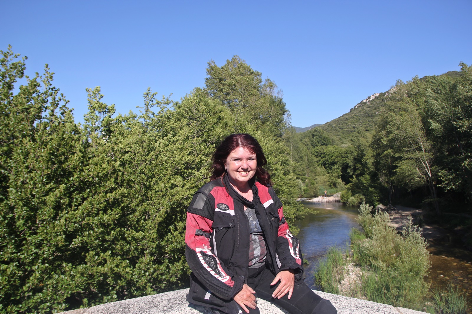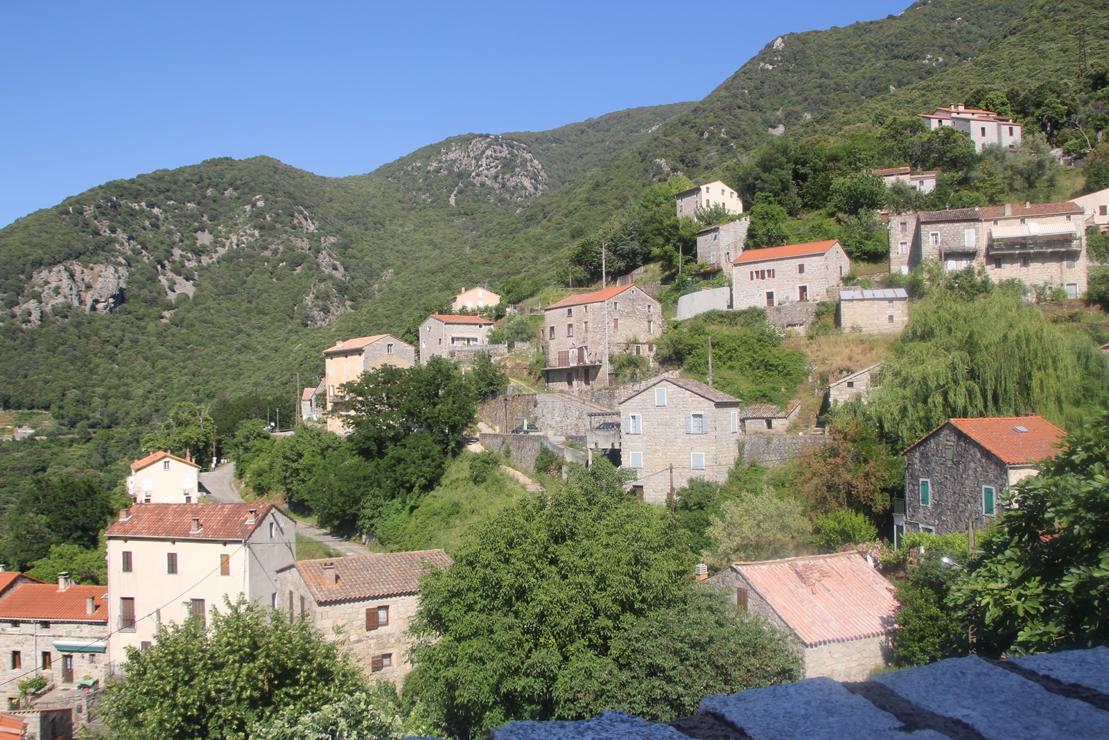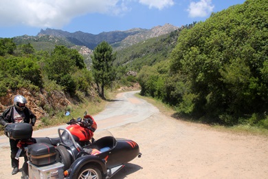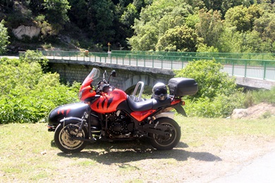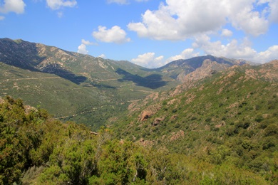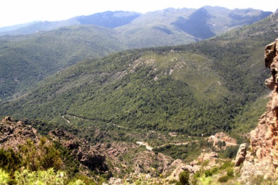 Wir folgten der schmalen D557 und kamen an dem aus nur wenigen Häusern und einem Hotel bestehende Burgo. Immer wieder sieht man Spuren des riesigen Brandes, der im Sommer 2009 einen nicht unwesentlichen Waldbestand bis hoch zum Monte San Pietru vernichtet hat. Bald schon erreichten wir den Weiler Martini. Ab hier stieg die Strasse steil an und führte über mehrere Kehren immer weiter hinauf. Rund 3 km nach Martini hielten wir an einer Linkskurve. Sie bot Parkmöglichkeiten sowie eine tolle Fernsicht auf das Tal bis zum Meer. Unter und der Fluss Baraci, in dem man baden kann. |