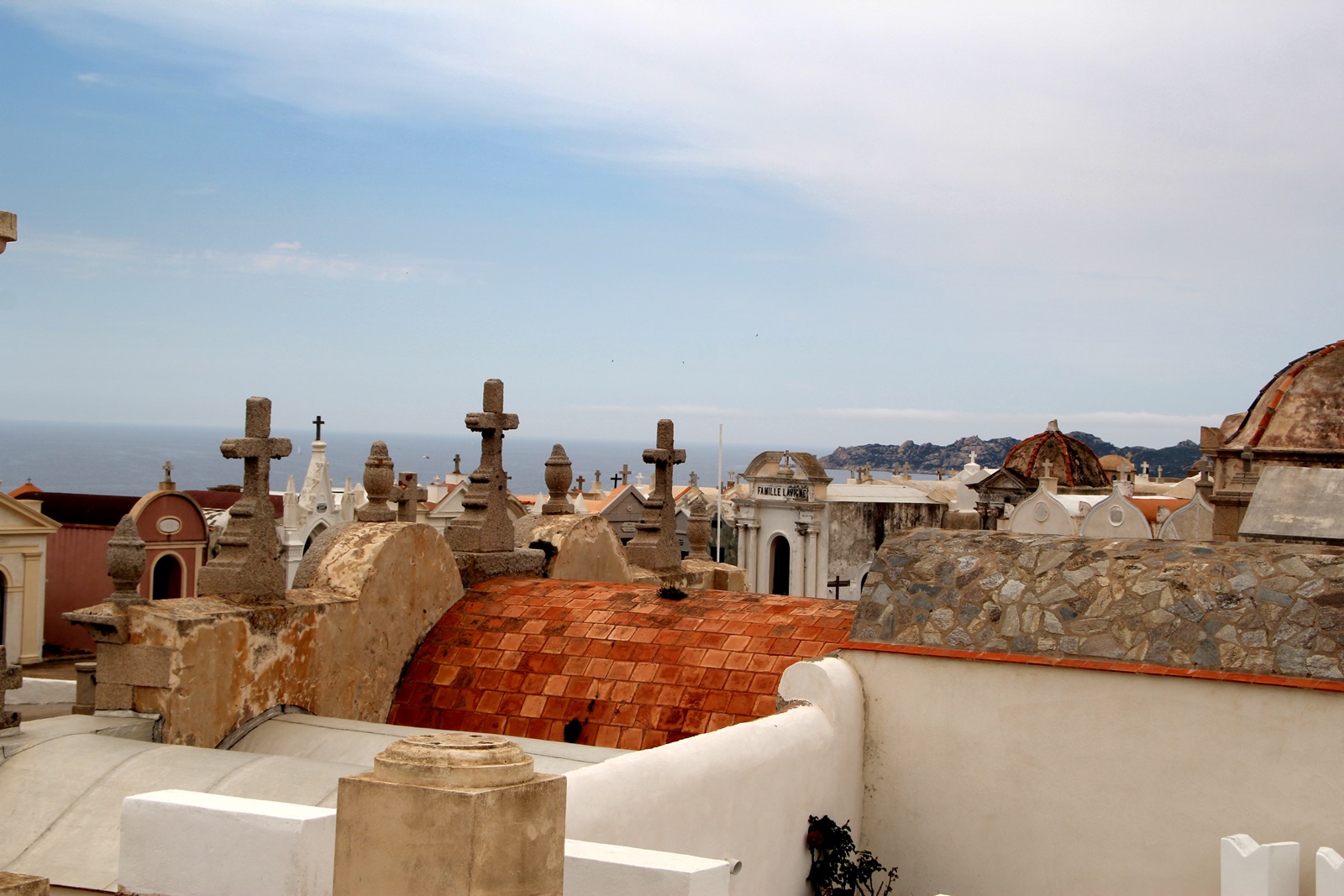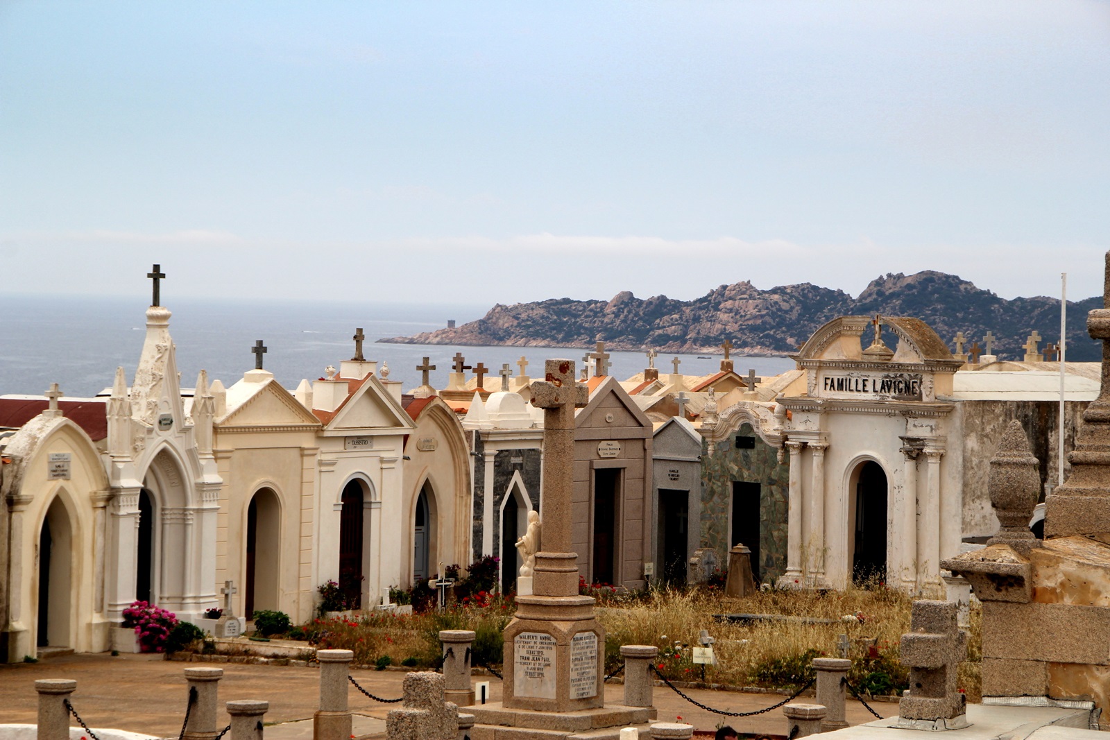 Cimetière Marin de Bonifacio - der historische Monumentalfriedhof mit unglaublichen Ausblick gehört zu den schönsten Friedhöfen Frankreichs! Einige Gräber sind top gepflegt, einige davon verfallen, wieder andere mit Unkraut zugewachsen. Anscheinend werden einige davon einmal im Jahr weiß gestrichen. Der südlicheste Friedhof Frankreichs platzt heute aus allen Nähten. Er ist dem kleinen ehemaligen Hof des Klosters von Saint François angelegt, von dem heute nur noch die Klosterkapelle und einige Nebengebäude übriggeblieben sind. Die Gemeinde hat deshalb außerhalb des historischen einige neue Grabreihen errichten lassen.