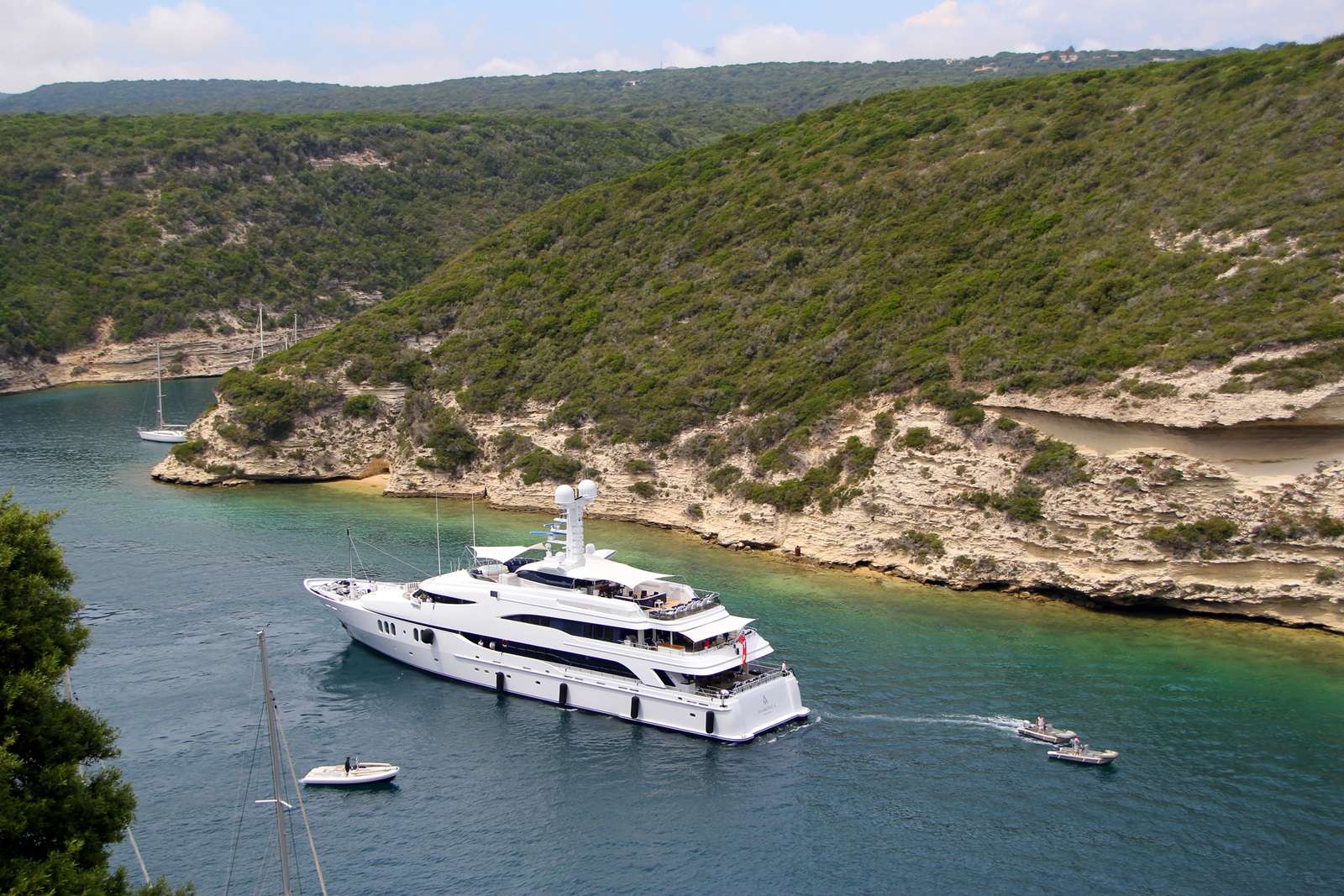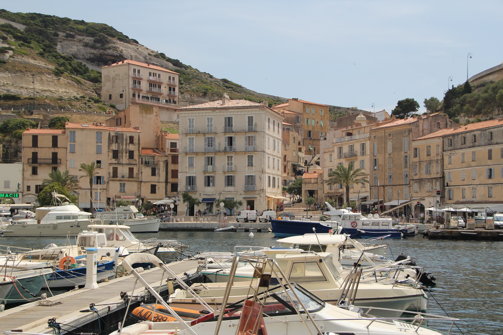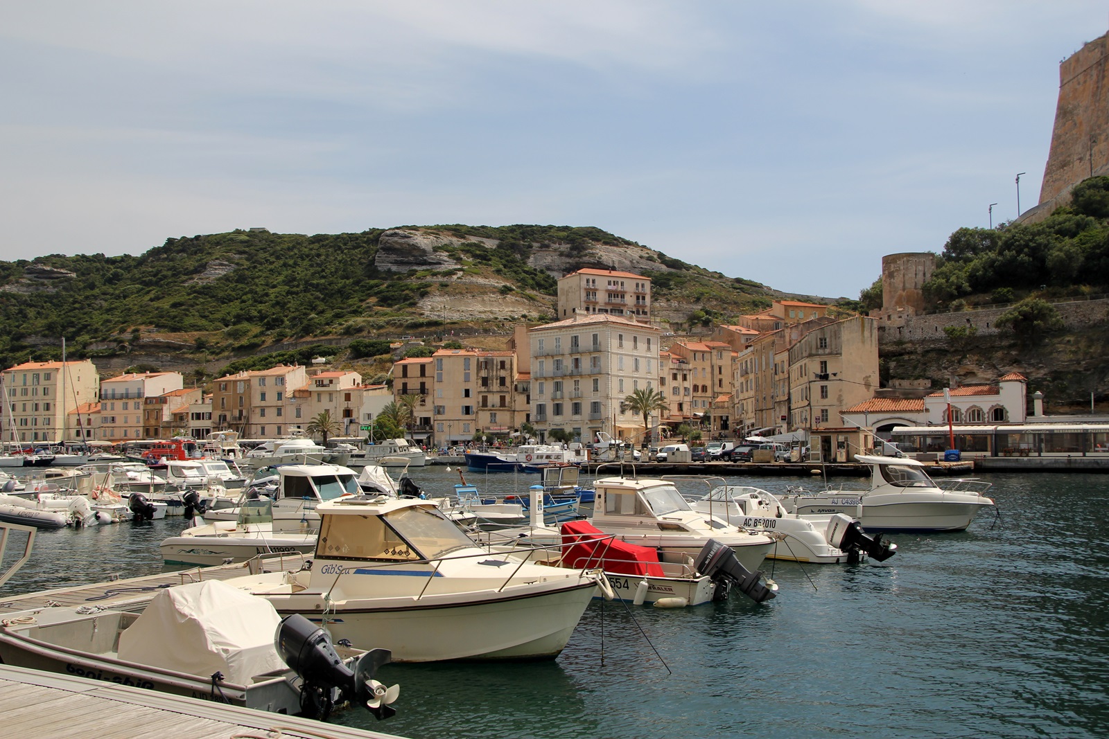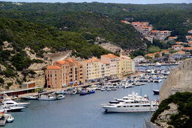 Die Ville haute liegt auf einer langen, schmalen, parallel zur Küste verlaufenden Landzunge aus Kalkstein, der Île de Fazio, An der Seeseite haben die steilen Kalkklippen eine durchschnittliche Höhe von 70 Metern. An der Landseite befindet sich eine fjordartige Bucht, die einen gut geschützten Naturhafen bildet. Bonifacio ist ein Zentrum der Handelsschifffahrt und des Fährverkehrs. Es liegen auch viele Yachten in sämtlichen Größen vorort. |