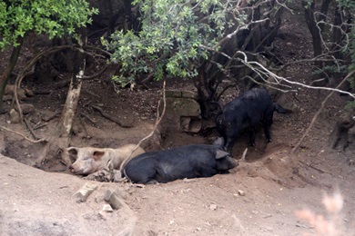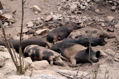 unterwegs sehr viele Schweine entweder hinter Zäunen oder entlang der Straße. Meist im Schatten dösend. |