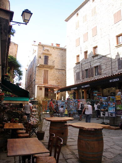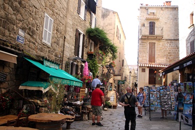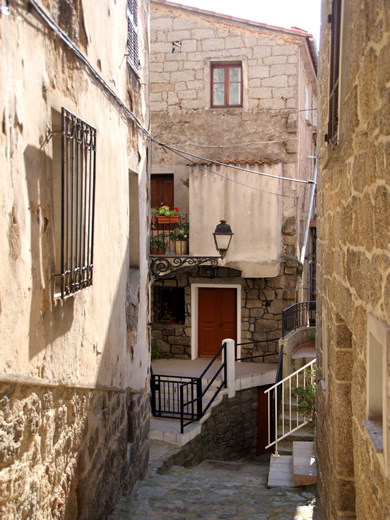 Sartene - die mittelalterliche Altstadt wurde ca. Mitte des 16. Jahrhunderts von der genuesischen Besatzungsmacht auf dem Felsvorsprung U Pitraghju erbaut und mit dicken Steinwällen gesichert. In einer fantastischen Panoramalage liegt das kleine Granitstädtchen hoch über dem breiten grünen Rizzanese-Tal und genießt einen einmaligen Blick auf die Bucht von Valinco und Propriano. Hinter Sartène liegt der Bergkamm von Alta Rocca. Man sagt Sartene sei "die korsischste Stadt Korsikas". Auf der Place de La Liberation, von den Einheimischen auch Place Porta genannt, herrscht das ganze Jahr über geschäftiges Treiben: Hier treffen sich Einheimische als auch Besucher aus aller Herren Länder in den zahlreichen Straßencafes, auf der Panoramaterrasse rund um das Kriegerdenkmal sowie auf der Freitreppe vor der kleinen Granitsteinkirche. Geht man durch das große Tor, gelangt man in die Altstadt, dem Quartier Pitraghju-Manighedda. Die hohen Häuser sind so eng aneinander gebaut, daß kaum ein Sonnenstrahl in die engen Gassen gelangt. Bei den vielen Treppen, Gässchen und Sackgassen muss man aufpassen, dass man sich nicht verläuft. |