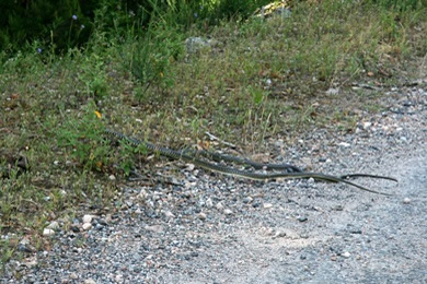 D69 Schlangen (ca. 60 cm) bei der Paarung am Straßenrand - das gibt es nur auf sehr einsamen Strecken. Auf ca. 30 Kilometer haben wir nicht ein Auto gesehen, dafür aber jede Menge wilder Tiere wie Ziegen und Schweine! |