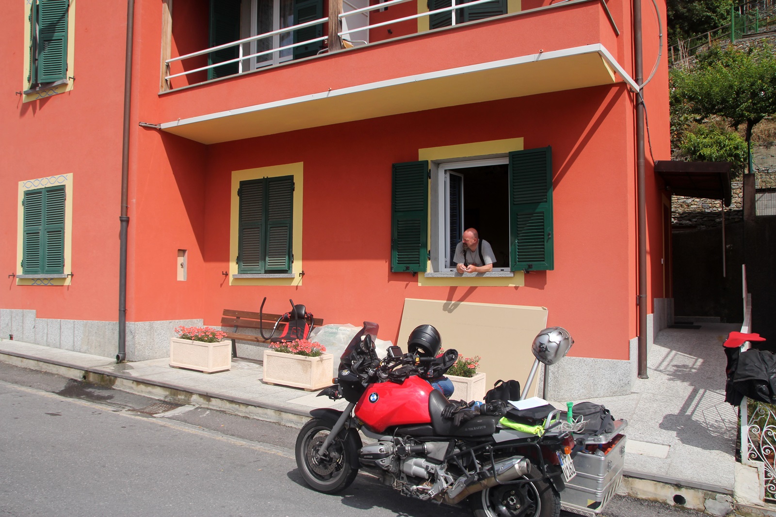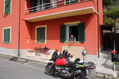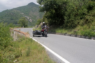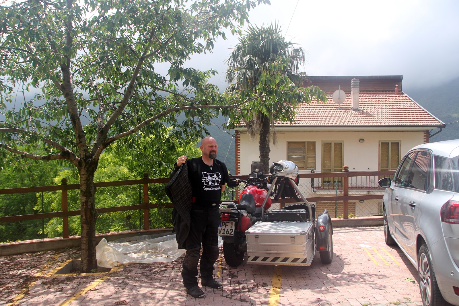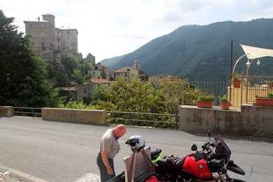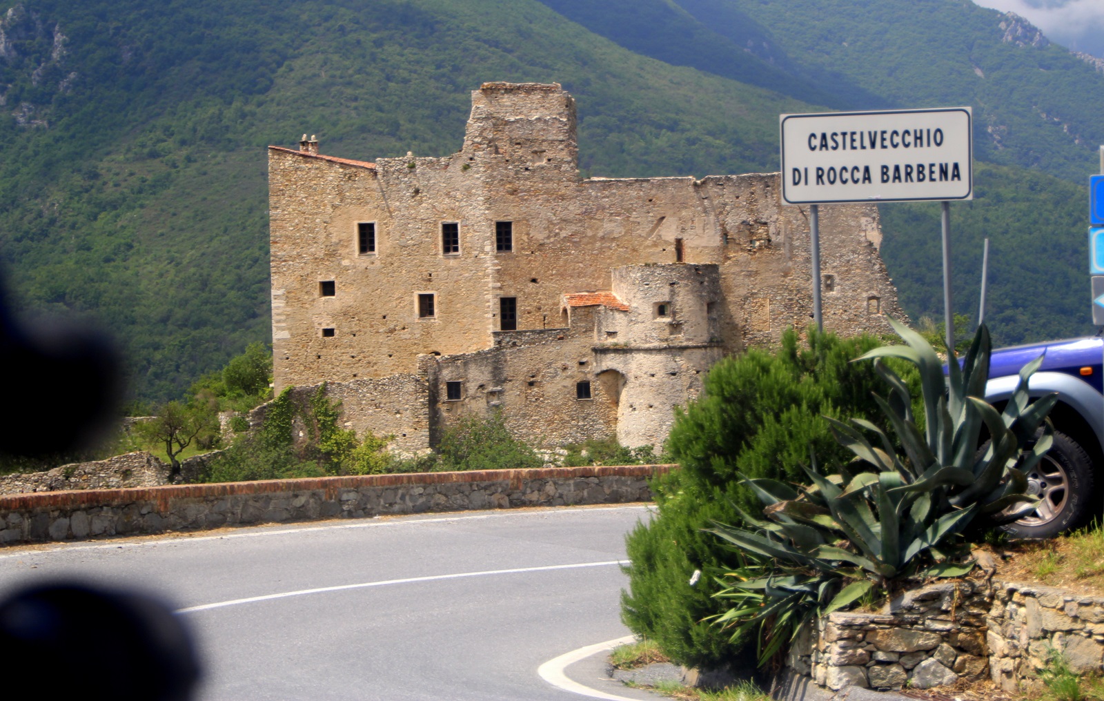 Hier in Castelvecchio di Rocca Barbena hatte ich mir das erste Mal einen Rückwärtsgang gewünscht. Das Navi führte uns mitten in die Altstadt rein und es sollte auf der anderen Seite auch wieder einen Weg rausgehen ...leider nein. Die Straße war eng und zugeparkt und ich sollte wenden! Irgendwie stand ich ungeschickt. Ein netter Einheimischer half mir freundlicherweise das Gespann zu schieben. Dafür war ich ihm sehr dankbar. |