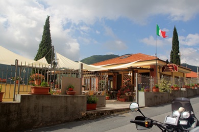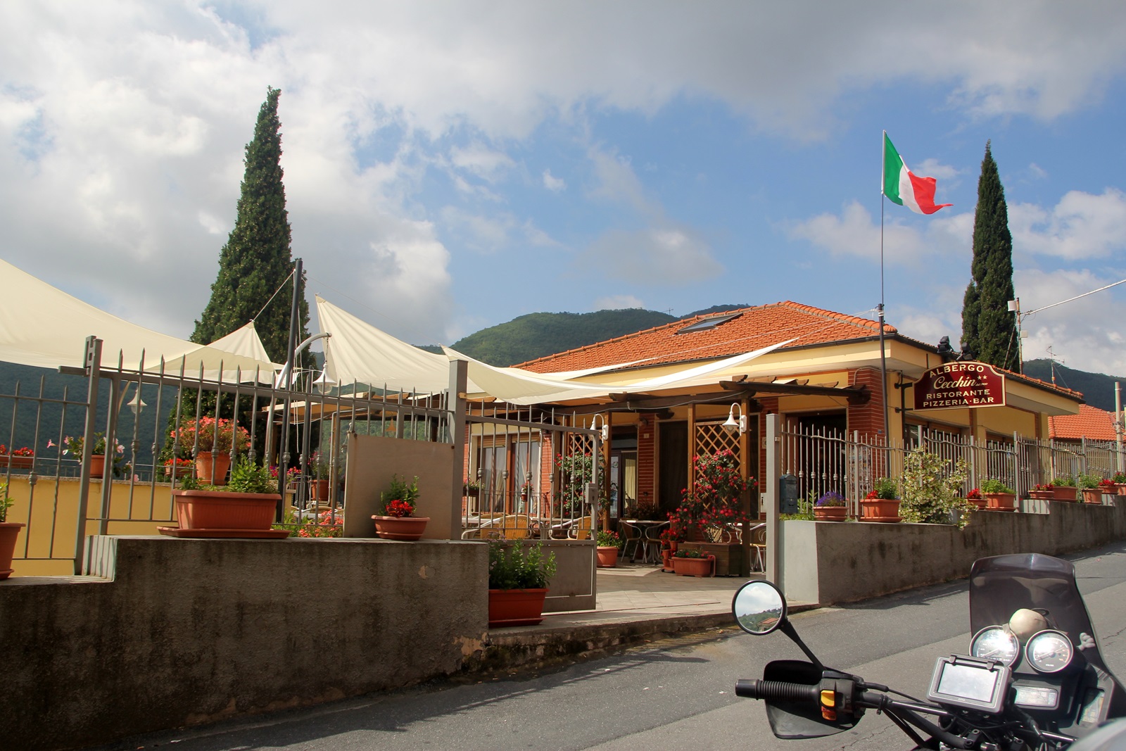 Diesen Tag gönnten wir uns nochmal um "eine Runde" durch Liguriens Hinterland auf kleinen kurvenreichen Strecken zu fahren. Es machte richtig spass....allerdings drohten immer wieder dunkle Wolken mit Regen. Hin und wieder trafen uns auch ein paar Tropfen. Wir genossen noch einmal das leckere Essen im Restaurant. Am nächsten Tag wollten wir eine große Etappe Richtung Heimat fahren. |