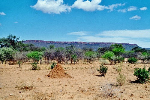 Im Vordergrund ein Termitenhügel und im Hintergrund das Waterberg Plateau