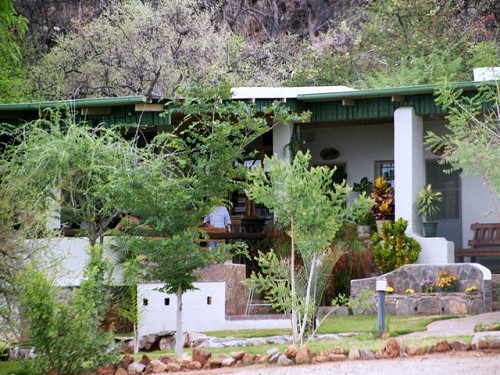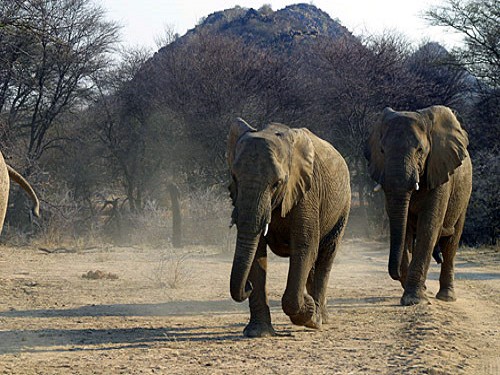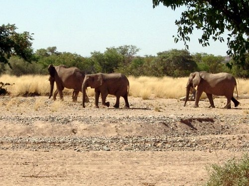 Tiere hatten wir nun genug gesehen und die Neugierde trieb uns weiter. Wir verließen den Park am Nachmittag über das Anderson Gate und fuhren nach Outjo, wo wir uns einen Bungalow im Buschfeldpark Resort für eine Nacht mieteten. Die Küche ist hier sehr lecker - wir aßen Kudu und Oryx mit leckeren Beilagen und dazu wieder das obligatorische Tafel-Lager-Bier. Bis spät in der Nacht unterhielten wir uns mit einem anderen Ehepaar: Ich glaube beide waren Lehrer frisch in Rente, die den Haushalt in Deutschland auflösen wollten um nur noch durch die Lande zu fahren. Ein bisschen neidisch waren wir schon. Am nächsten Morgen nach einem ausgiebigen Frühstück erkundeten wir Outjo und frischten unsere Vorräte wieder auf. Es gab hier alles was das Herz begehrte: Einen großen Supermarkt, Bäckerei, Tankstelle und Courioshop für Souveniers.... Anschließend fuhren wir ins Ugabtal zur bekannten Vingerklip (ca. 35 Meter hoch) und den Tafelbergen. Das Damaraland ist sehr beeindruckend und die Straße war ein stetes auf und ab. Bei ca. 35°C im Schatten erklommen wir tapfer die Vingerklip (Finger Gottes) und wurden von einer gandiosen Aussicht über das Ugabtal belohnt. In der Ferne sah man die vielen Ugab-Tafelberge, die weit über das Land hinausragten. Dann fuhren wir weiter nach Khorixas um zu tanken! Um es kurz zu sagen: Die Erfahrung an der Tankstelle in Khorixas muss man nicht haben. Wir waren schlagartig umringt von Einheimischen, die uns geschnitzte Makalani-Nüsse und anderen Kram verkaufen wollten. Man könnte es mit einem Schwarm Fliegen auf einem Stück Fleisch vergleichen. Die Leute waren sehr aufdringlich und wir schworen uns nie mehr hier zu tanken. Wir fuhren weiter zum "Versteinerten Wald". Hier handelte es sich um liegende Baumstämme, die früher mit Schlamm bedeckt waren und durch die Kieselsäure "versteinerten". Dann suchten wir eine Bleibe für die Nacht. Wir wählten das Aba Huab-RestCamp, weil es bekannt war für seine wilden Elefanten. Kurz vor dem Camp sahen wir auch schon die ersten Elefanten herumlungern. Wir fuhren langsam an ihnen vorbei und sie beobachteten uns ganz genau. Die Damaraelefanten waren viel kleiner als die im Etoscha NP. Das Camp war einfach mit Duschen/WC und einem kleinen Getränke-Shop mit Barbereich, der von Damaras bewirtet wurde, ausgestattet. Nachdem wir ein schönes Plätzchen zum Campen direkt am Rand des ausgetrockneten Flussbettes gefunden hatten, gingen wir zur Bar um uns den Staub aus den Kehlen zu spülen. Es wurde uns von den Damaras gleich erklärt, dass das Flussbett den Elefanten gehört und für uns Menschen tabu sei. Wir hatten verstanden. Eine Holländerin wollte nicht hören und kletterte das Flussbett hinunter um bessere Bilder von den Elefanten machen zu können. Plötzlich hörten wir lautes Tröten! Die Elefanten fühlten sich bedroht zumal sie auch Junge hatten und stürmten auf die Dame und somit auf das Camp zu. Das alles schien nicht ungefährlich. Die Einheimischen kamen angerannt und vertrieben die Elefanten mit lauten Rufen und Winken. Das war ein netter Adrenalinschub am Nachmittag. Das Camp versprach Abenteuer. Nachdem wir unser erstes Tafel-Lager des Tages an der Bar getrunken hatten, wollten wir uns wieder zu unserem Campingplatz aufmachen um zu grillen, als wir wiederum lautes Tröten von einem Elefanten hörten. Diesesmal kam es nicht vom Flussbett - und plötzlich bebte die Erde. Bum-Bum-Bum - ein in mächtiger Elefant, der sich wohl auf der anderen Seite des Camps befunden hatte, rannte mit erhobenen Rüssel quer durch das Camp und trampelte ein Zelt nieder, das ihm im Weg stand. Zum Glück war niemand in dem Zelt drin. Irgendetwas musste ihn erschreckt oder verärgert haben. Und das alles passierte keine 10 Meter von uns entfernt! WOW! Nun ja, wir wollten Elefanten und nun hatten wir sie. Von unserem Platz aus konnten wir den ganzen Abend die Elefanten bei ihrem Treiben im Flussbett beobachten. Es war gigantisch. Als es dunkel wurde hörten wir plötzlich Geräusche von links. Es war eine Art brummen und knacken von Ästen. Wir wußten, dass die Elefanen nachts durch das Camp ziehen würden und nun kamen sie gemächlich fressend auf unseren Übernachtungsplatz zu! Schnell räumten wir alles weg und legten uns in unser Auto, damit wir alles ganz genau sehen konnten. Nicht dass wir Angst hatten, aber wir wollten nicht unbedingt den Dickhäutern im Wege stehen. Dann waren sie da! Hätte ich die Hand aus dem Fenster gestreckt, hätte ich sie berühren können - wow. Ich habe keine Worte für diesen Moment. Am nächsten Morgen fuhren wir zum "verbrannten Berg" und den "Orgelpfeifen" (eckige Basaltsäulen, die bis zu 5 Meter hoch sind) - na ja, wir waren beide der Meinung es reicht wenn man diese Attraktionen einmal im Leben gesehen hat. Ganz in der Nähe war auch Twyfelfontein (zweifelhafte Quelle) mit den bekannten Felsmalereien. Hier nahmen wir an einer Führung zu den Felsmalereien teil. Es gab hier tausende davon und hauptsächlich Zeichnungen von Tieren. Manche Malereien waren auch schon sehr verblichen. Im Anschluss daran fuhren wir das Mädchen, das uns geführt hatte, in ihr Dorf zurück. Hierzu mußten wir ein ordentliches Stück auf schlechter Pad fahren. Sie erzählte uns, dass es auch hier einige Elefanten gäbe und sie vor ihnen angst hätte. |