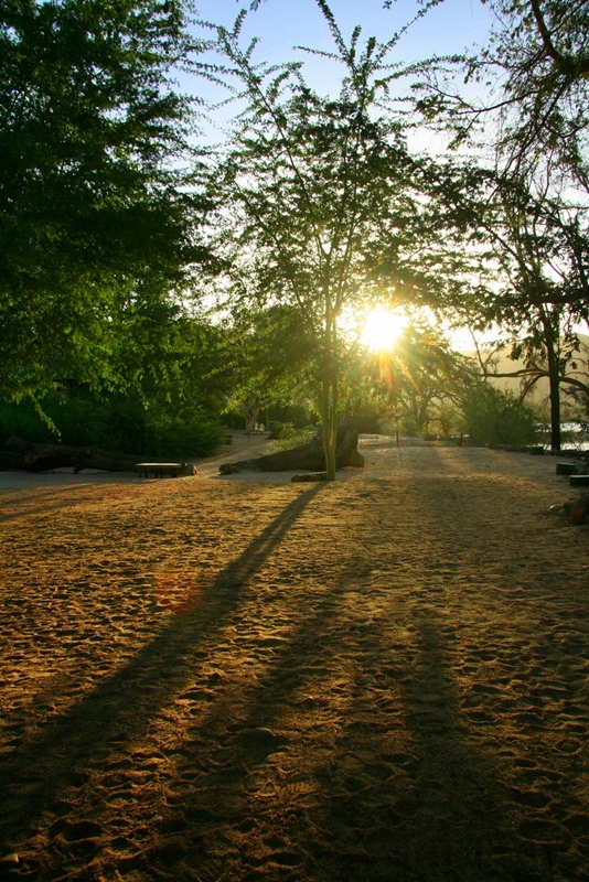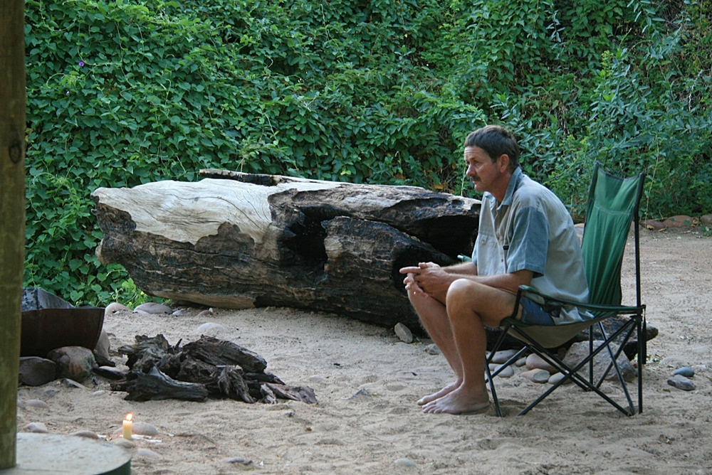 Abendstimmung im Camp Syncro - die Schatten werden länger. Es war wieder zeit für den Grill. An diesem Abend gab es etwas ganz besonderes: Elefantenfleisch! Das hatten wir noch nie gegessen. Jochen war sehr neugierig, ich eher skeptisch. Dennoch hatten wir beide das Fleisch gegessen. Es schmeckte so ganz anders als die Fleischsorten, die wir bislang kannten. Ein kleines Stück genügte mir - ich bevorzugte dann lieber Marius' geniale Braaiwoers zu essen. Aber das ist sicherlich Geschmackssache. |