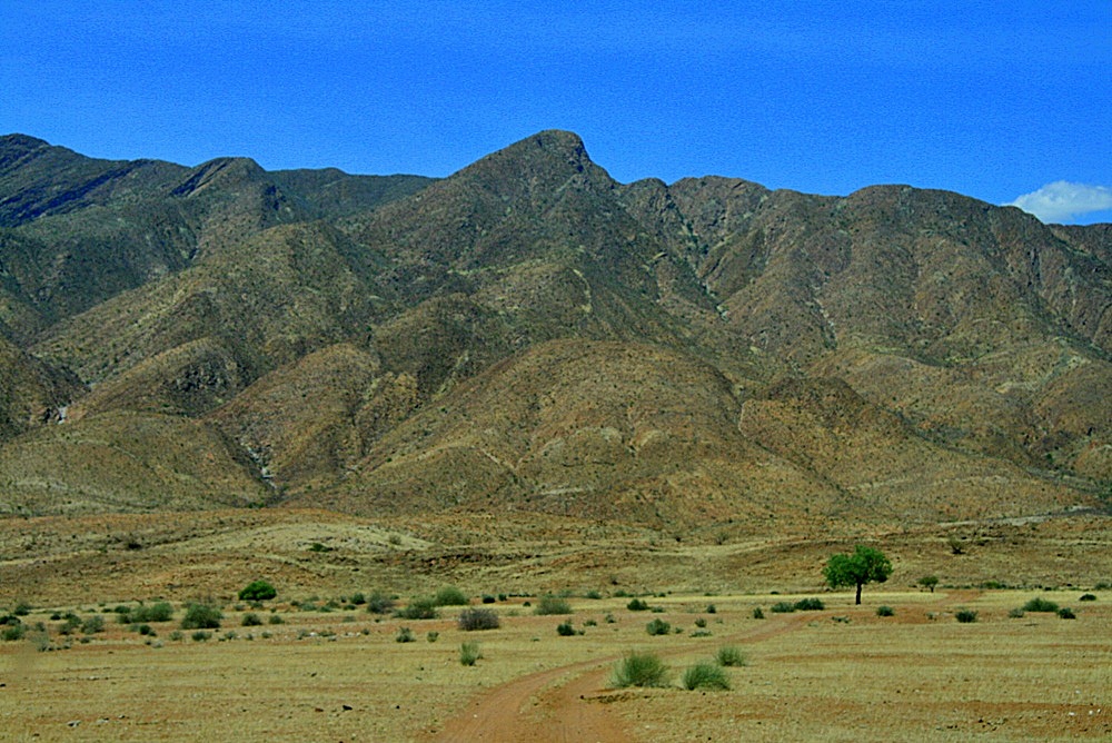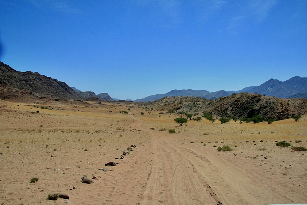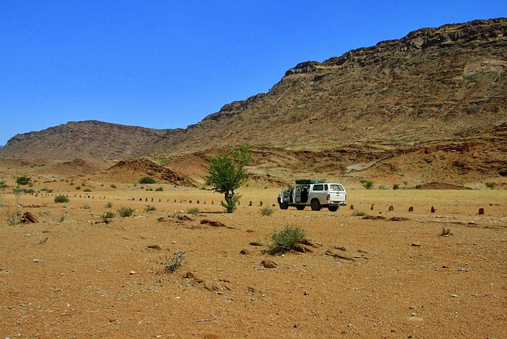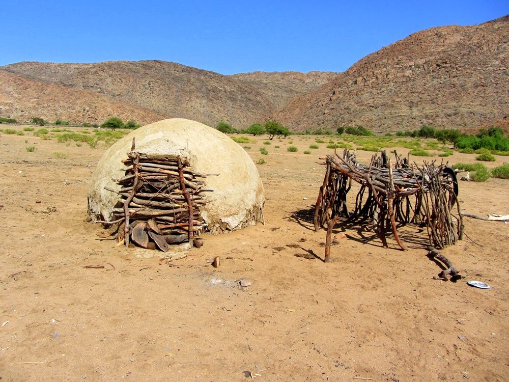 Unterwegs trafen wir auf einen verlassenen Himbakraal (Dorf). Da der Kraal nicht nicht auf Himbaart "abgeschlossen" war, betraten wir das Innere. Aufgrund der Trockenheit schien die Familie weitergezogen zu sein. Die Tiere brauchten Wasser und Nahrung. |