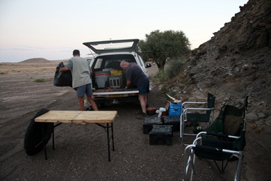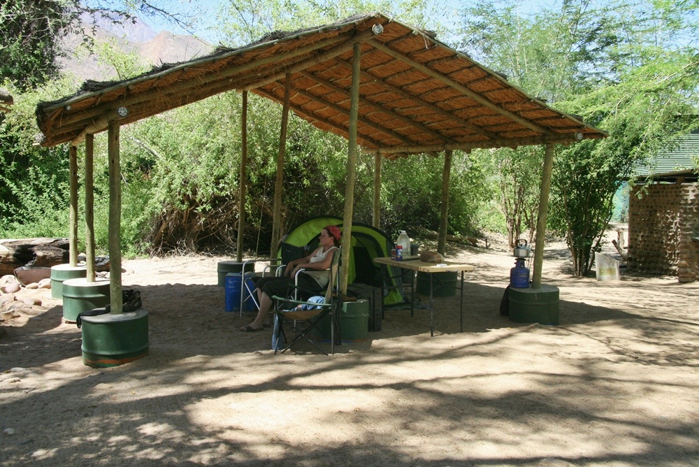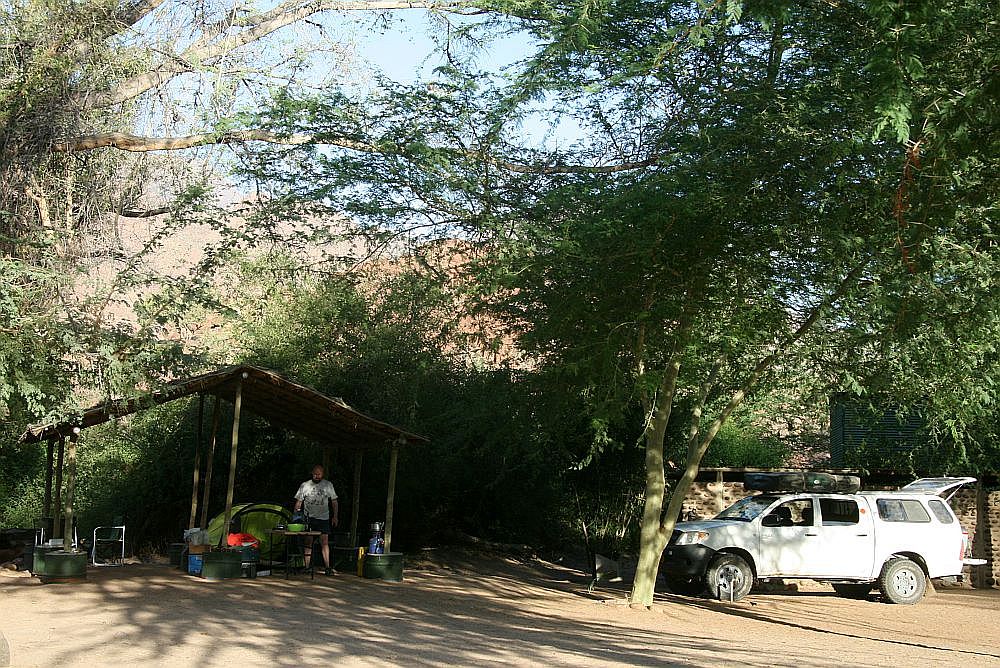 Marius hatte wieder seine Baumdusche aufgebaut und heute mussten wir bei Taschenlampenlicht duschen. Die Glut im Grill war mittlerweile auch schon soweit und dann gab es wieder Marius leckere selbstgemachte Braaiwoers, dazu einen Salat, Kartoffeln und Zwiebeln in Alufolie. Ein eisgekühltes Tafel Lager zum Essen durfte natürlich nicht fehlen. Wieder ging ein ereignisreicher Tag zuende. Wir saßen noch einige Zeit am Lagerfeuer und unterhielten uns..... |