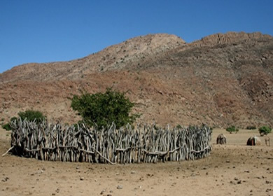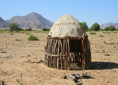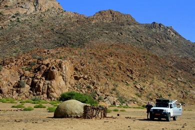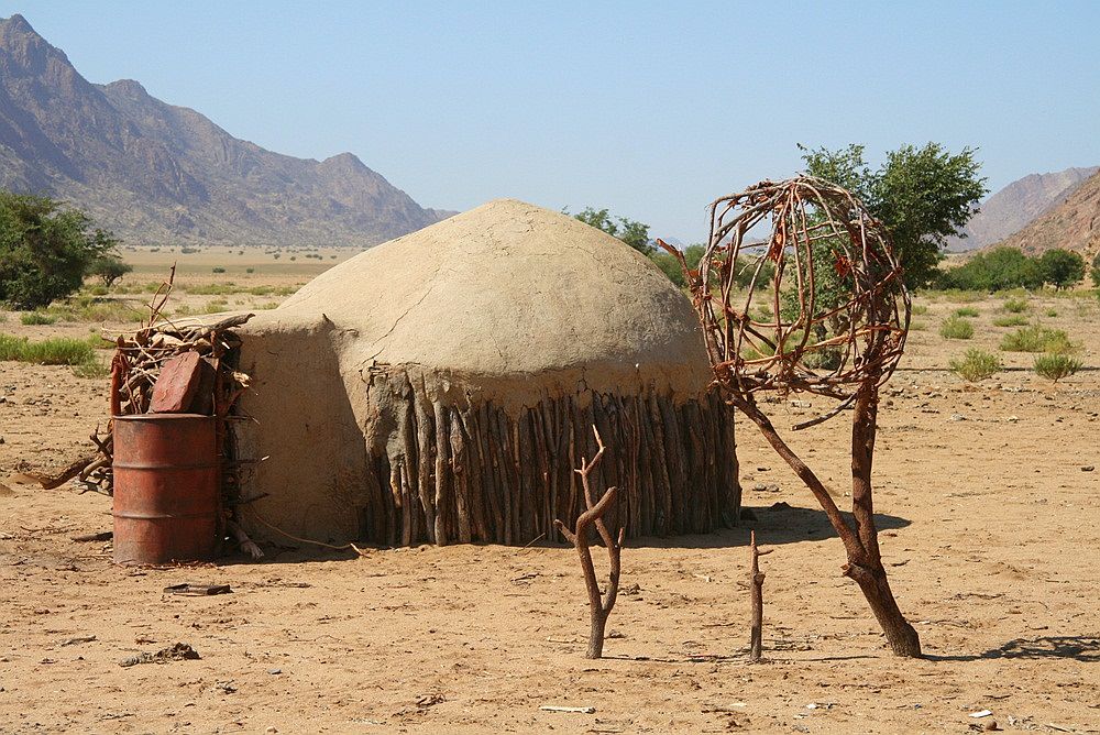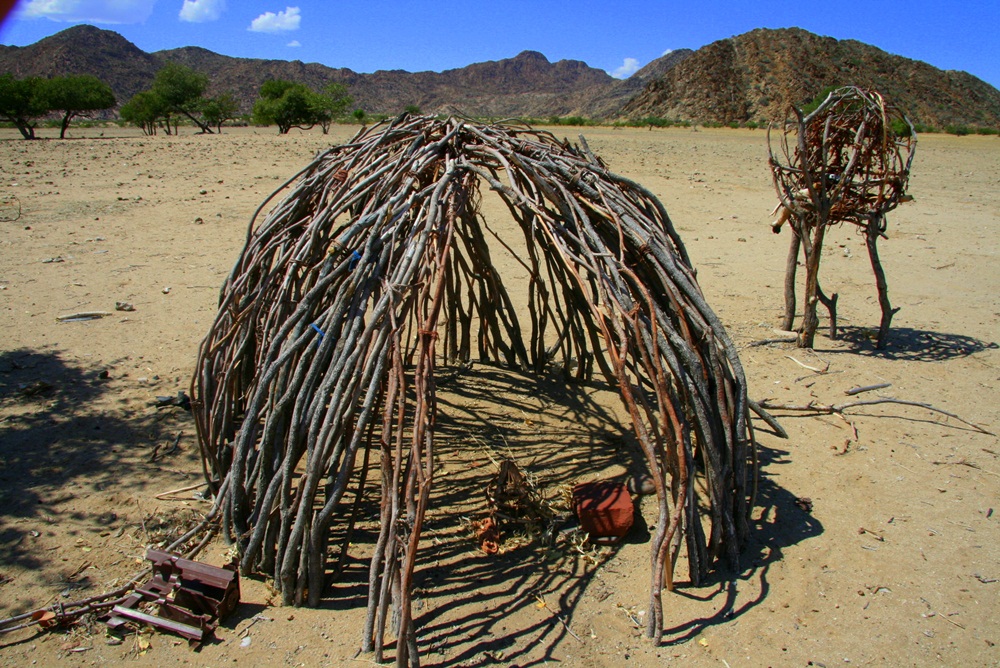 Irgendwann unterwegs trafen wir wieder auf ein verlassenes Himbadorf. Linkes Bild ein "Stall" für die Rinder. Rechtes Bild eine Himbahütte wohl noch nicht ganz fertig gestellt. |