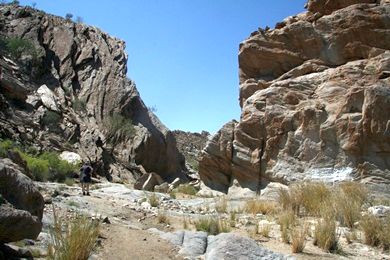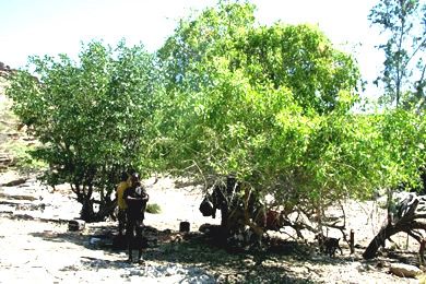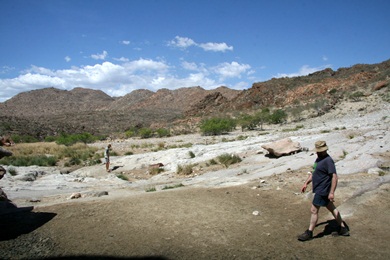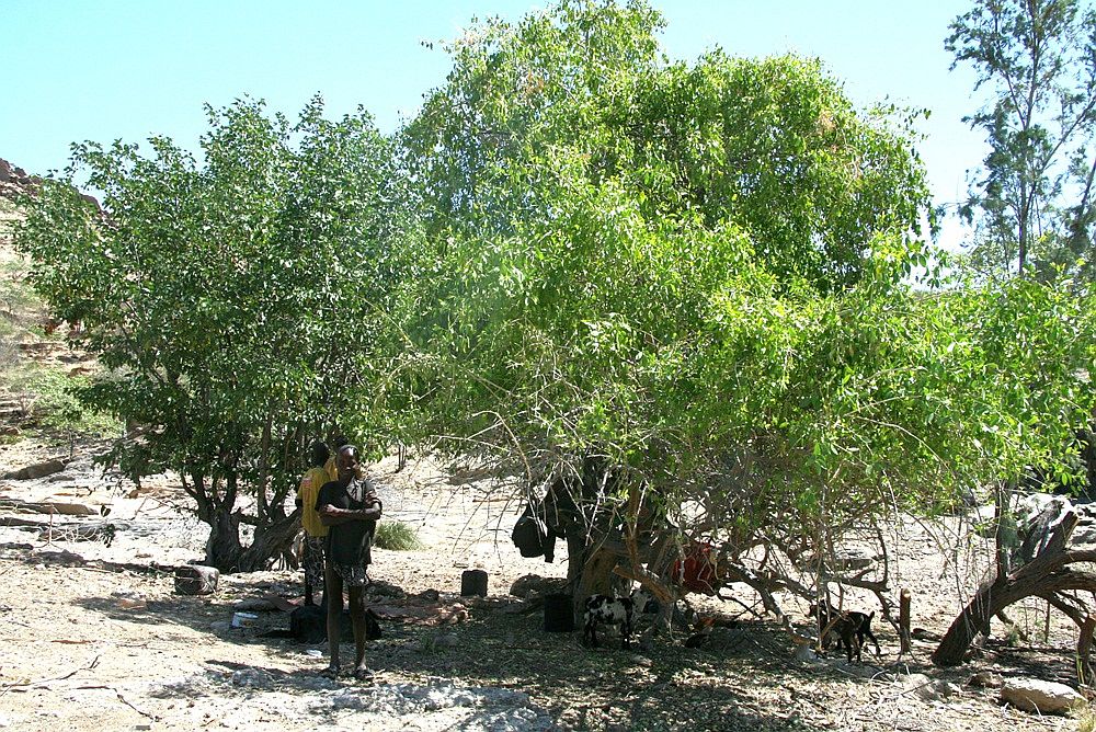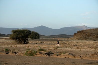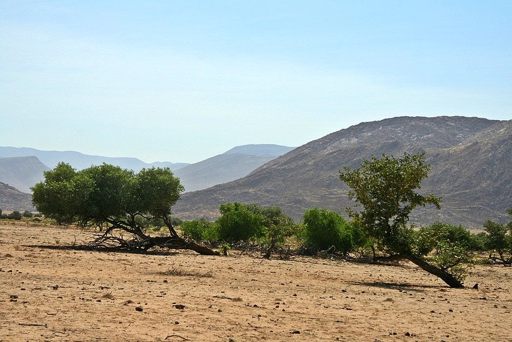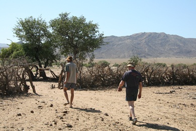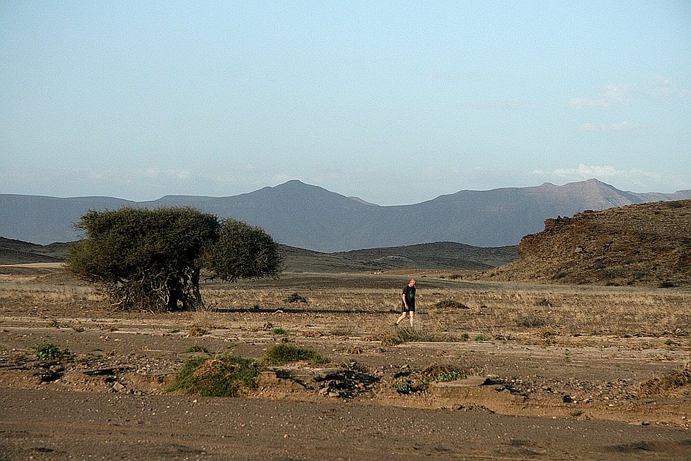 unterwegs in einem Trockenflußtal mit einigen Makkalanibäumen |