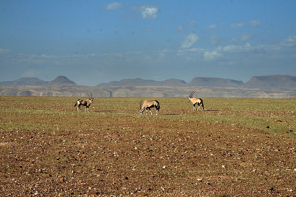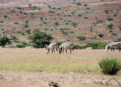 Heute hieß es Abschied nehmen von Camp Syncro - unsere Tour durchs Kaokoveld ging weiter und wir waren schon sehr neugierig was Marius noch so alles geplant hatte. Wir fuhren ca. 1 Stunde auf einsamer Pad, als wir das erste Mal an diesem Tag auf ein paar Zebras und Springböcke trafen. Wir konnten es einfach noch nicht fassen, dass es innerhalb von 3 Jahren fast keine wilden Tiere mehr geben sollte. |