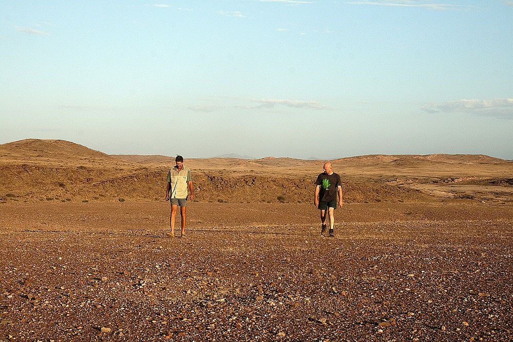 Wir hatten recht, es waren ein paar Himbakinder +/-10 Jahre alt, die von einem schwarzen Labradorhund begleitet wurden. Diese Hunderasse ist für diese Gegend sehr ungewöhnlich. Die Kinder erzählten uns, dass sie hier schon ca. 1 Woche alleine seien und auf die Ziegen aufpassen würden. Die Familie sei eine Tagesreise weit entfernt. Man merkte an ihrem Verhalten, dass sie an Fremde nicht gewöhnt waren. Doch da Marius die Sprache der Himba sprach, war der Bann schnell gebrochen. |