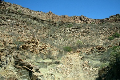 Dann bogen wir irgendwann mal ab und verließen das Marienflusstal. Der Weg wurde rasch wieder steinig und felsig und stieg stetig an. Marius erklärte uns, dass dies ein verlassener Militärweg sei, der uns zu einer alten Mine führen würde. Das letzte Stück war sehr steil und konnte nur im Low-Allradgang bewältigt werden. |