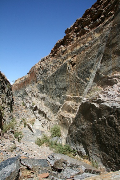 Steiniger felsiger Militärweg. Dieser Abschnitt war der schwierigste Teil. Es ist schlecht zu erkennen, aber es ging sehr steil nach oben und er endet an der oberen Felskante in eine weite Hochebene. |