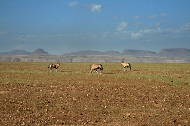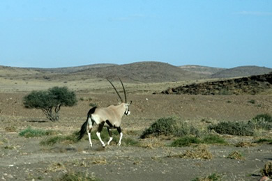 Auf der Suche nach einem Übernachtungsplatz fuhren wir durch ein trockenes Flussbett. Dieser Oryx stand am Rande und graste in aller Ruhe. Kurz vor unserem Auto überlegte er es sich und nahm uns fast die "Vorfahrt". |