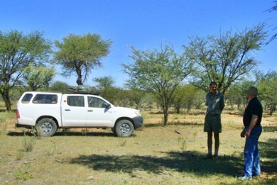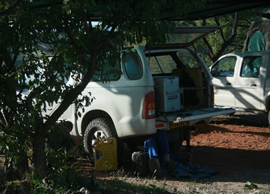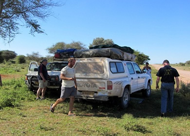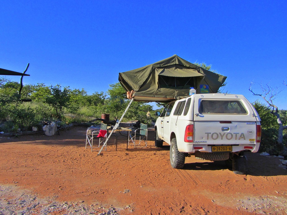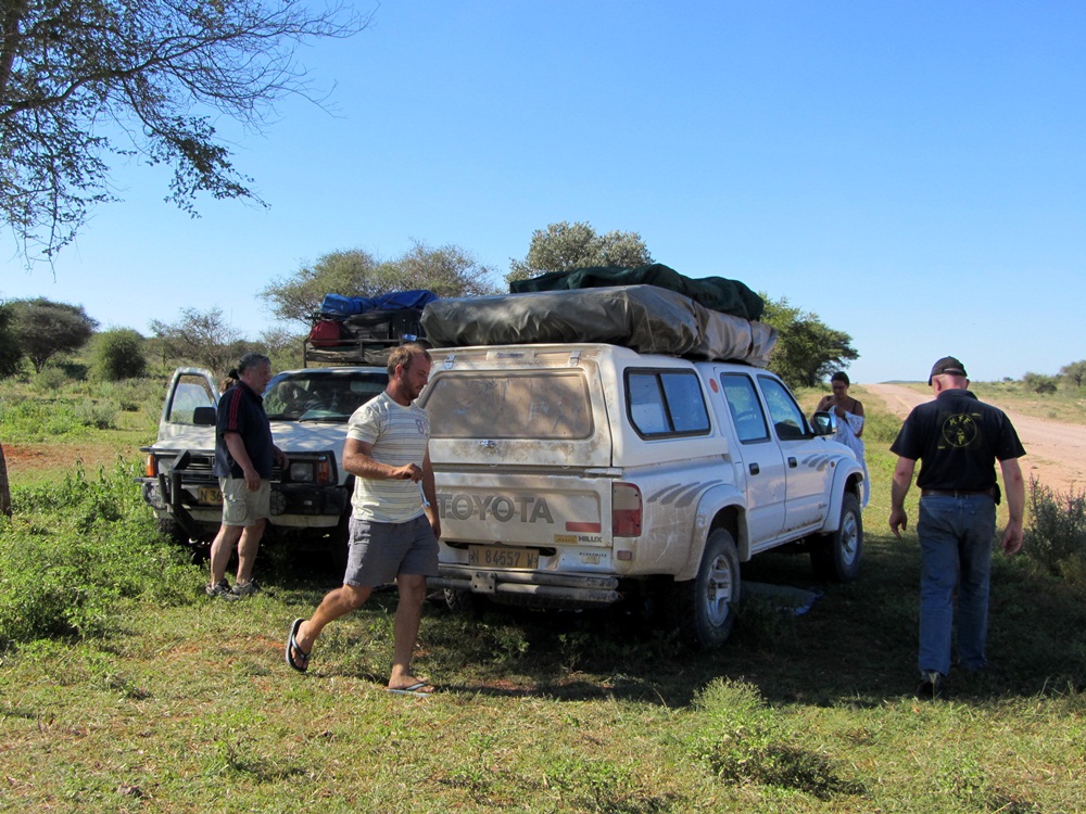 Tatsächlich kam der Fahrer von Kalahari Car Hire mit einem Ersatzwagen am selben Tag nachts um 23:30h auf Camp Aussicht an. Es war ein deutlich neueres Modell, das dann eher unserer Buchung entsprach. Schnell wurde alles Notwendige getauscht und der Fahrer machte sich mit der alten ausgenudelten Karre wieder auf den Heimweg. Fahren konnte man ja noch - nur der Allrad war defekt. |