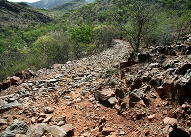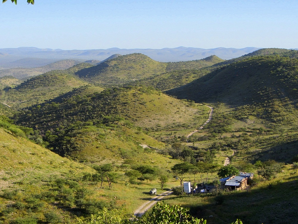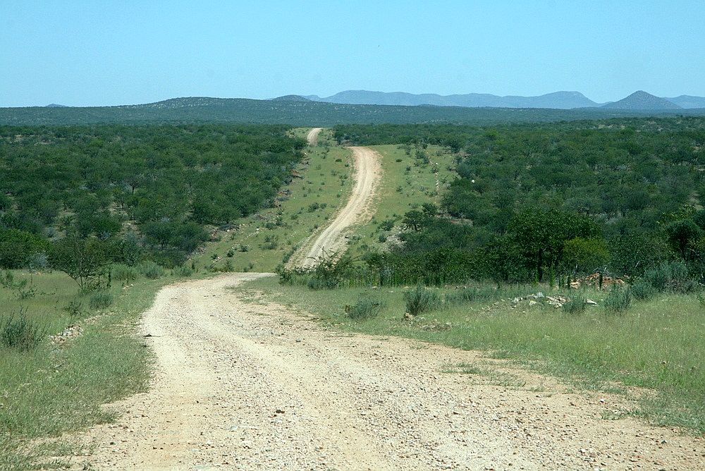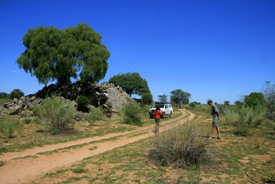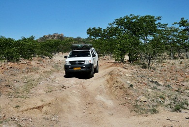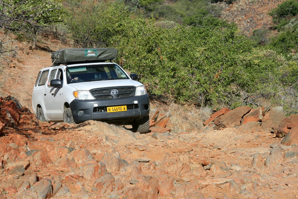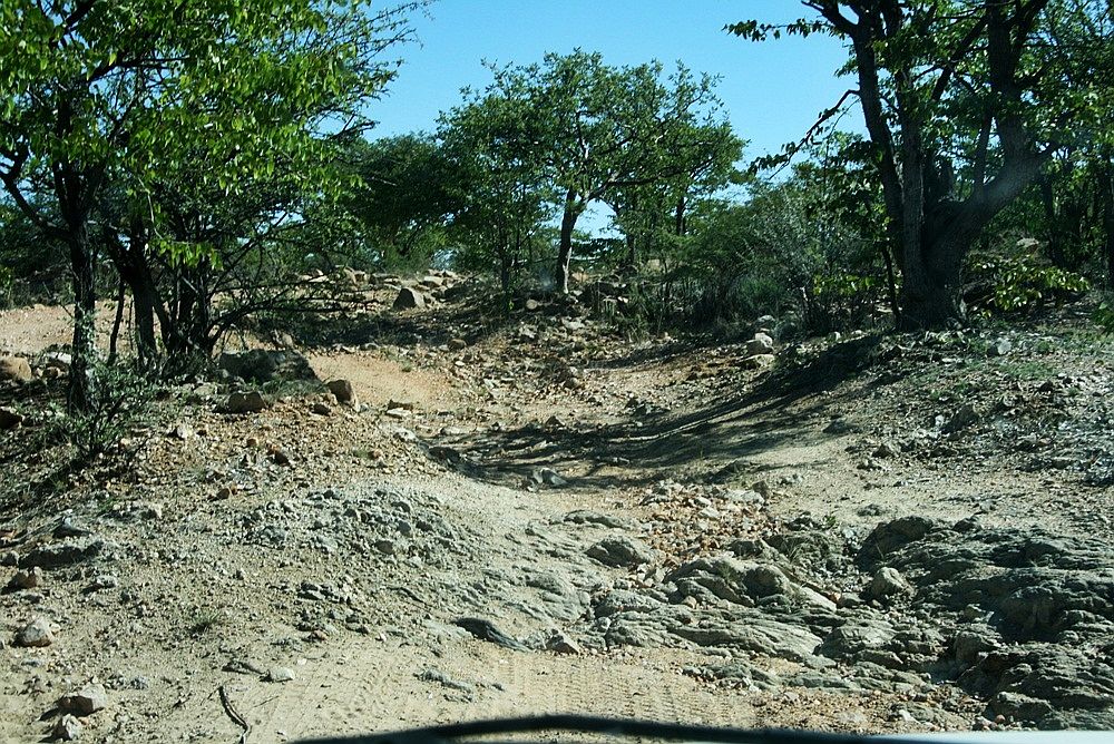 Seit Etanga geht es hier nur noch im Schritttempo weiter. Die "Pad" besteht nicht etwa aus Kies, sondern aus den blanken Felsen oder großen Steinen. Immer wieder muss man die Pad von Hand ausbessern, damit die Felsstufen auch mit einem 4x4 "fahrbar" werden. Selbst mit den hohen Geländewagen muss man die Route mit Bedacht wählen um nicht aufzusetzen. |