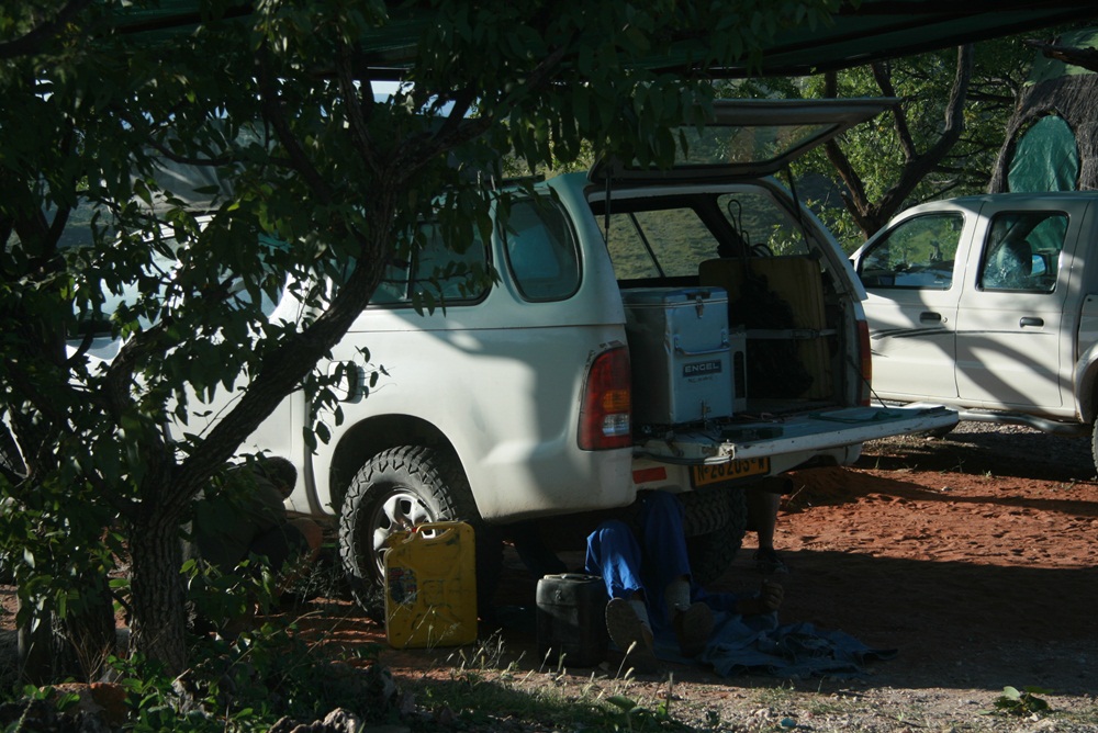 An diesem Tag sollte unser Abenteuer Kaokoveld beginnen. Früh am Morgen brachen wir auf. Doch nach ca. 20 Kilometern meinte Marius, dass mit dem Fahrzeug etwas nicht stimmten würde..... es roch nach Verbranntem und es lief Öl aus. Marius kontrollierte das Auto und wurde auch gleich fündig. Es war das Differential! Das war für unsere geplante Tour natürlich ganz schlecht! Wir brauchten unbedingt den Allrad.