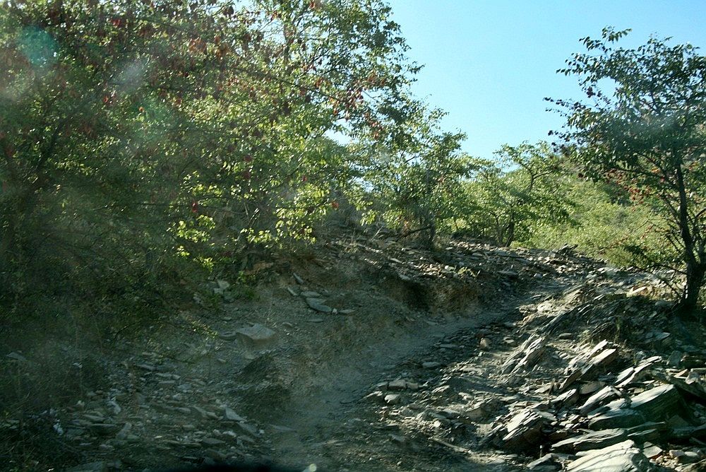 felsiger Aufstieg - man mußte ziemlich acht geben vor spitzigen Steinen und Felsstufen - auf der einen Seite ging es über eine Klippe mindestens 50 Meter tief runter. Kein schöner Gedanke da mit dem Auto abzustürzen. |