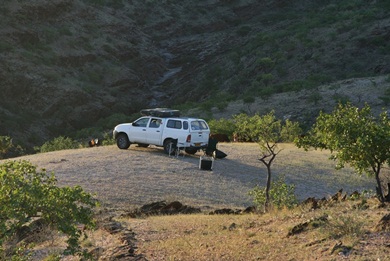 Geschafft - wir sind am Aussichtspunkt vom Van Zyls Pass - unserem Übernachtungsziel für heute angekommen. Vor dem Anstieg zum Aussichtspunkt fuhren wir an einer Herde von Ziegen vorbei, die von Himbakindern bewacht wurde. Wir hatten unsere Sachen noch nicht ausgepackt standen sie auch schon da und beobachteten uns interessiert. Sie freuten sich über die Abwechslung und staunten was die Fremden so alles mit sich führten. Marius unterhielt sich mit ihnen und erfuhr, dass das letzte Auto vor ca. einer Woche hier vorbeigefahren war. Als die Kinder ihm erzählten, dass sie sich fast auschließlich von Ziegenmilch ernährten, überreichte er ihnen ein frisches Brot und sie trollten sich nach einiger Zeit. Bei dieser Gelegenheit erfuhren wir auch, dass die Kinder komplett über Wochen auf sich alleine gestellt hier oben aushielten. Die Eltern waren aktuell unten im Tal bei den Rindern. |