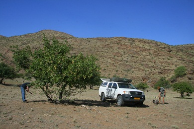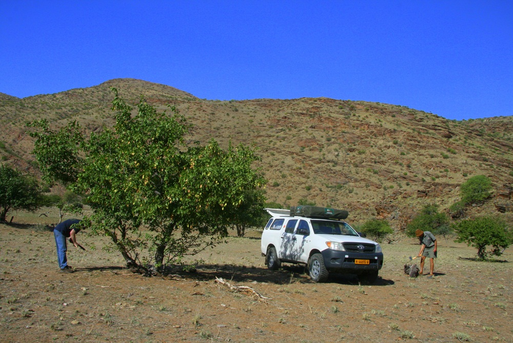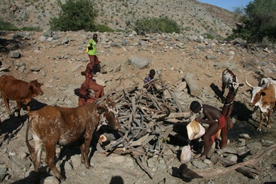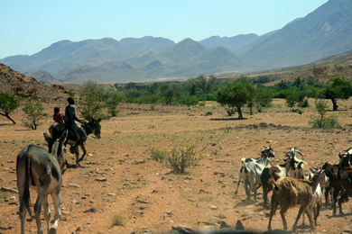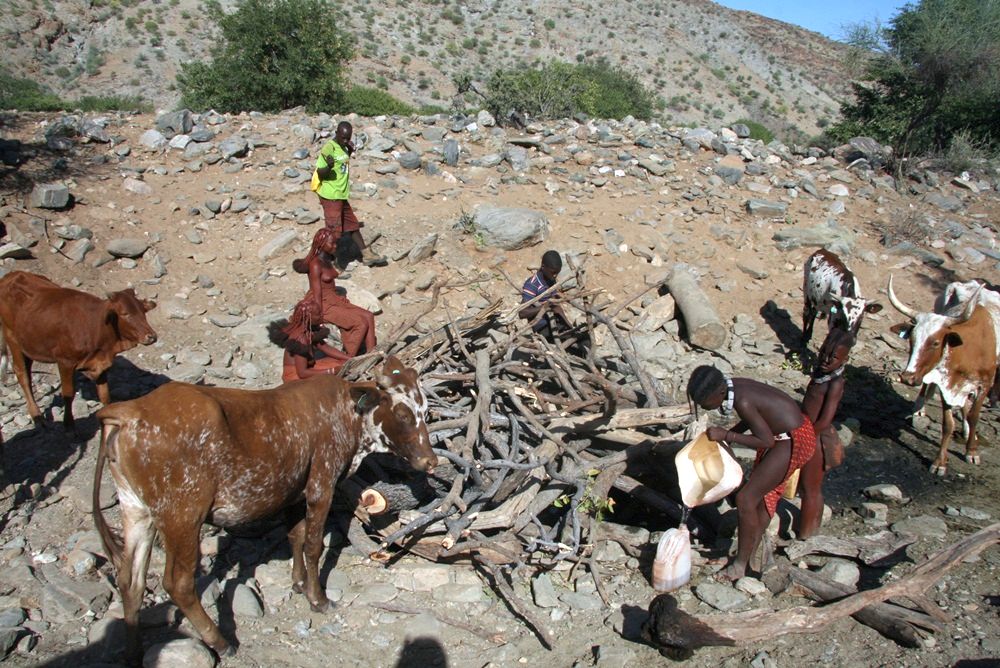Doch die Himbas stehen 2012 vor einem ganz anderen Problem. Wenn es nicht mehr regnet, verdursten und verhungern ihre Tiere. Der Bestand der eigenen Herden hat in den regenreichen Jahren enorm zugenommen und jetzt ist kein Wasser und kein Gras für die vielen Tiere da. |