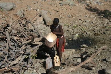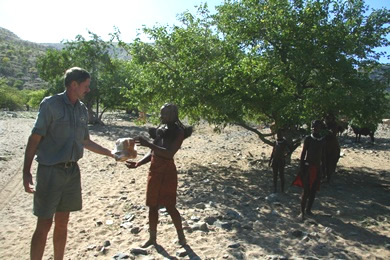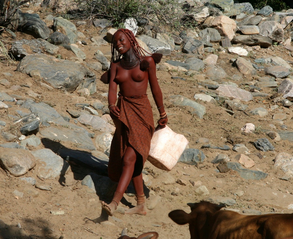 Irgendwo im Tal trafen wir auf eine Himbafamilie, die mit ihren Tieren gerade an der Wasserstelle weilten. Wir fragten ob wir etwas bleiben dürften und Bilder machen. Im Gegenzug sollten Sie dann Brot und Mehl erhalten. |